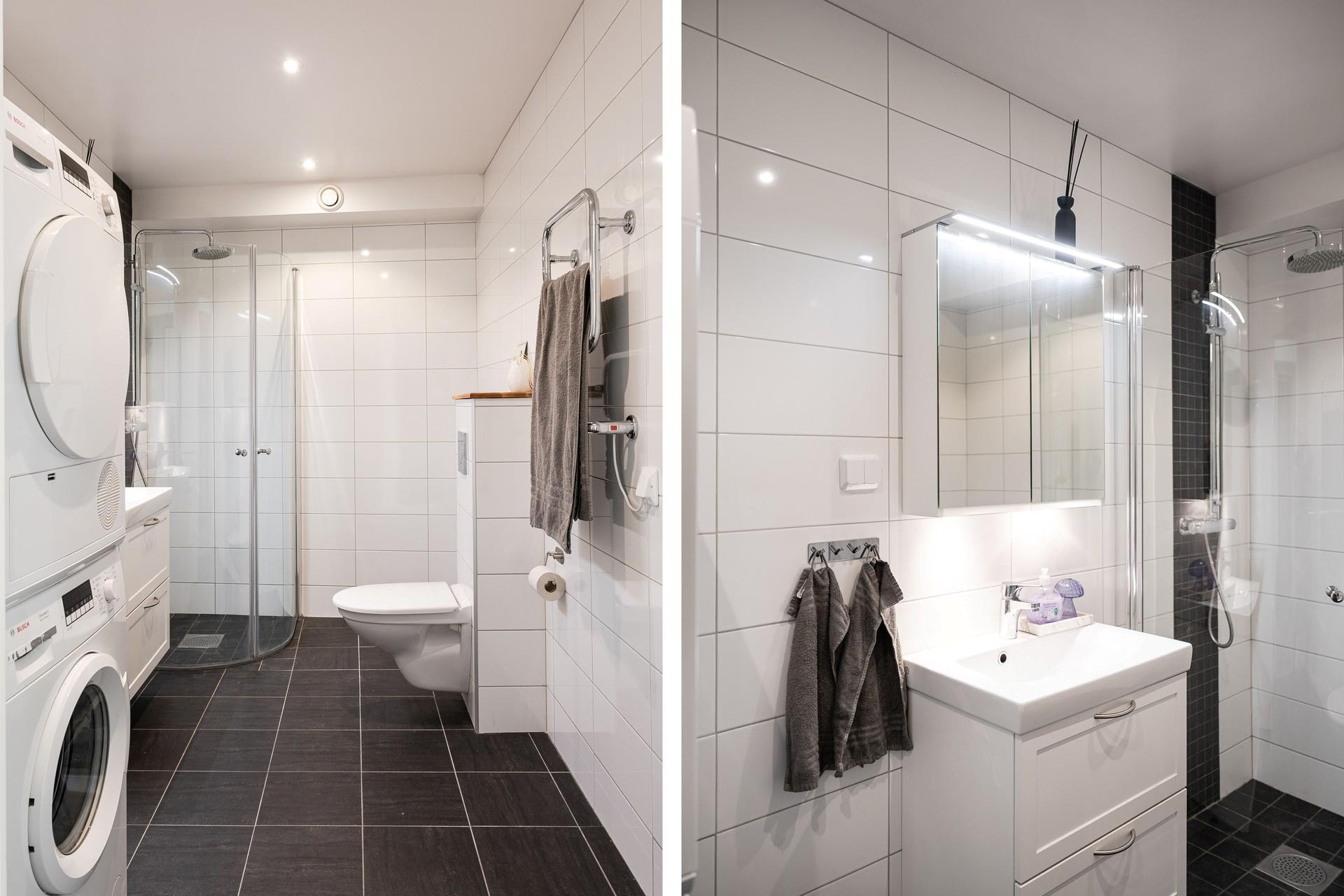 Utrustningen består av ett vitt tvättställ med kommod, dusch med glasvägg, handdukstork, spegel med belysning samt wc. Spotlightsbelysning i tak och praktiskt med både tvättmaskin och torktumlare.