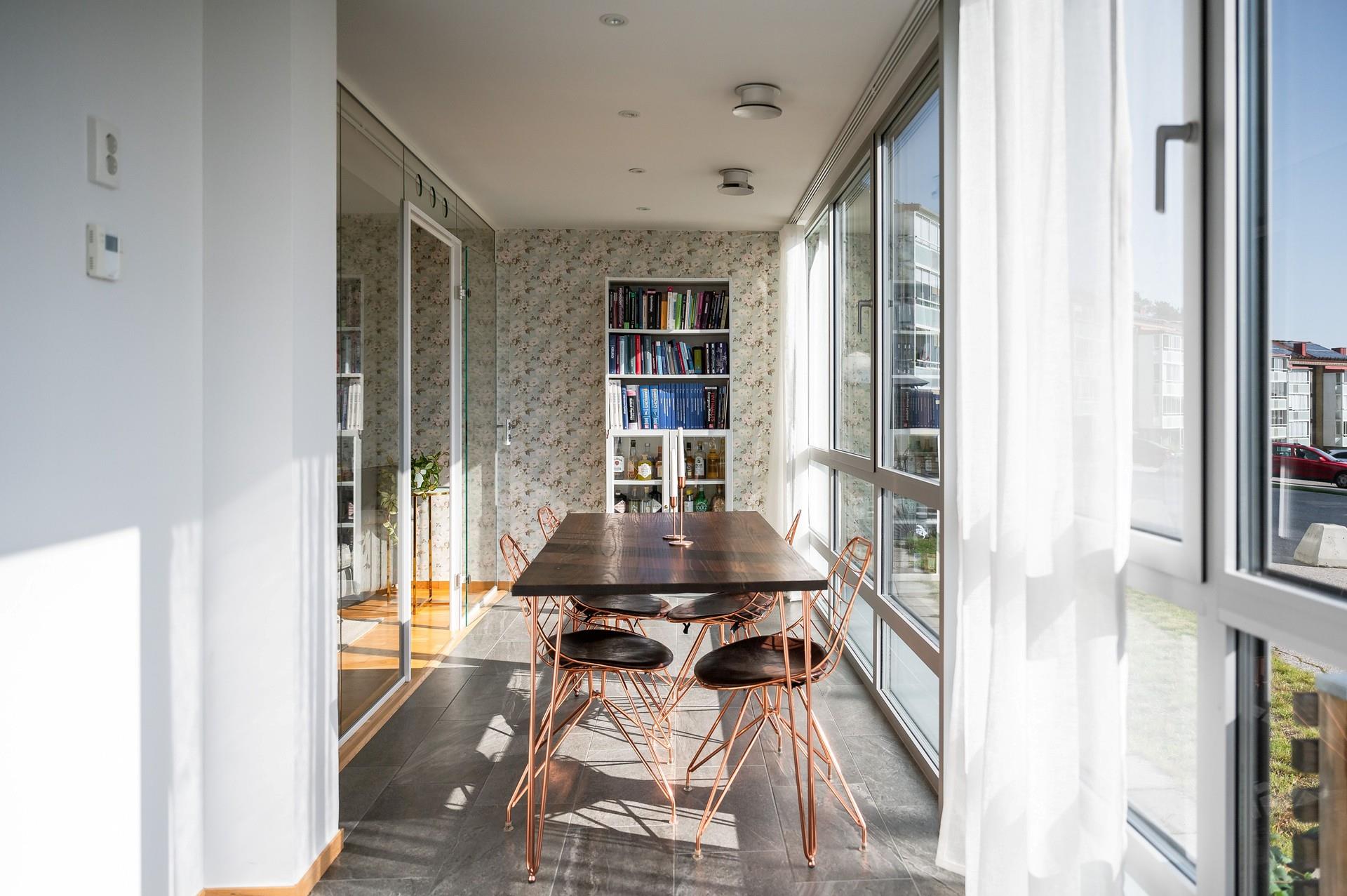 Luftigt allrum med stora fönsterpartier och fantastisk utsikt. Från detta rummet når man det inglasade uterummet med plats för loungegrupp och matplats. Här har du också vidsträckt utsikt över Sundvalls centrum. Glasdörrarna mot uterummet skapar en luftig atmosfär