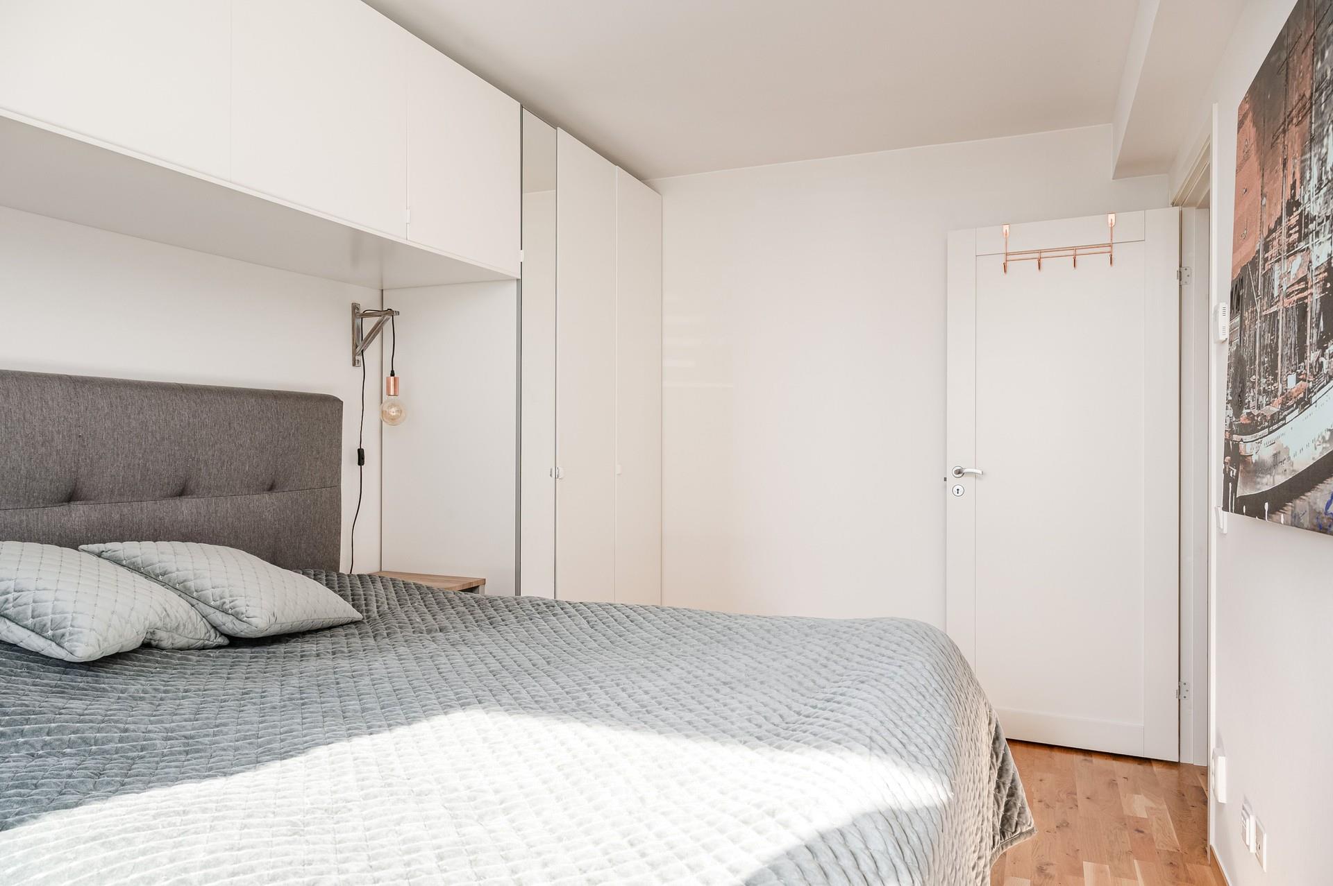 Luftigt sovrum med plats för dubbelsäng. Förvaring i garderober.