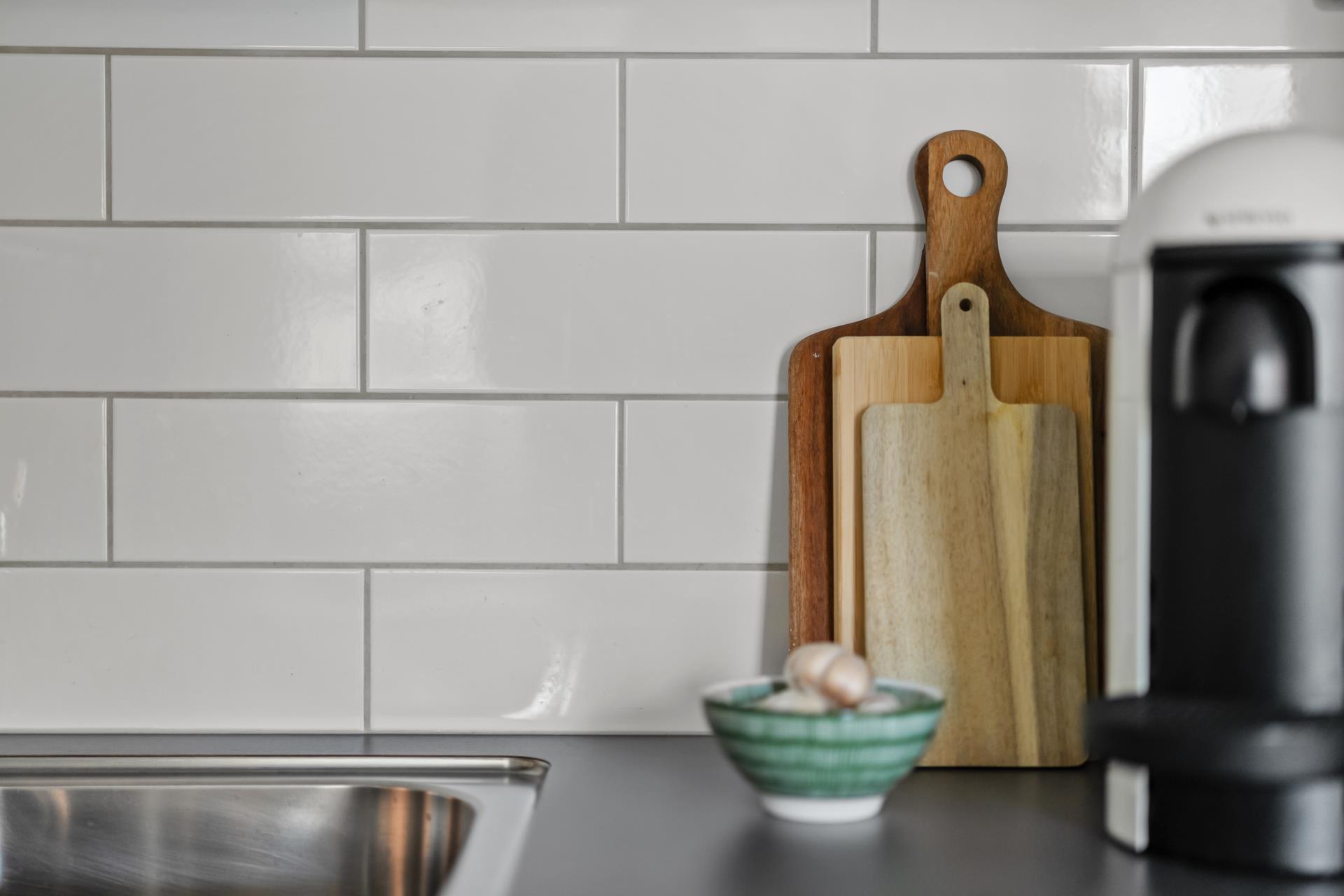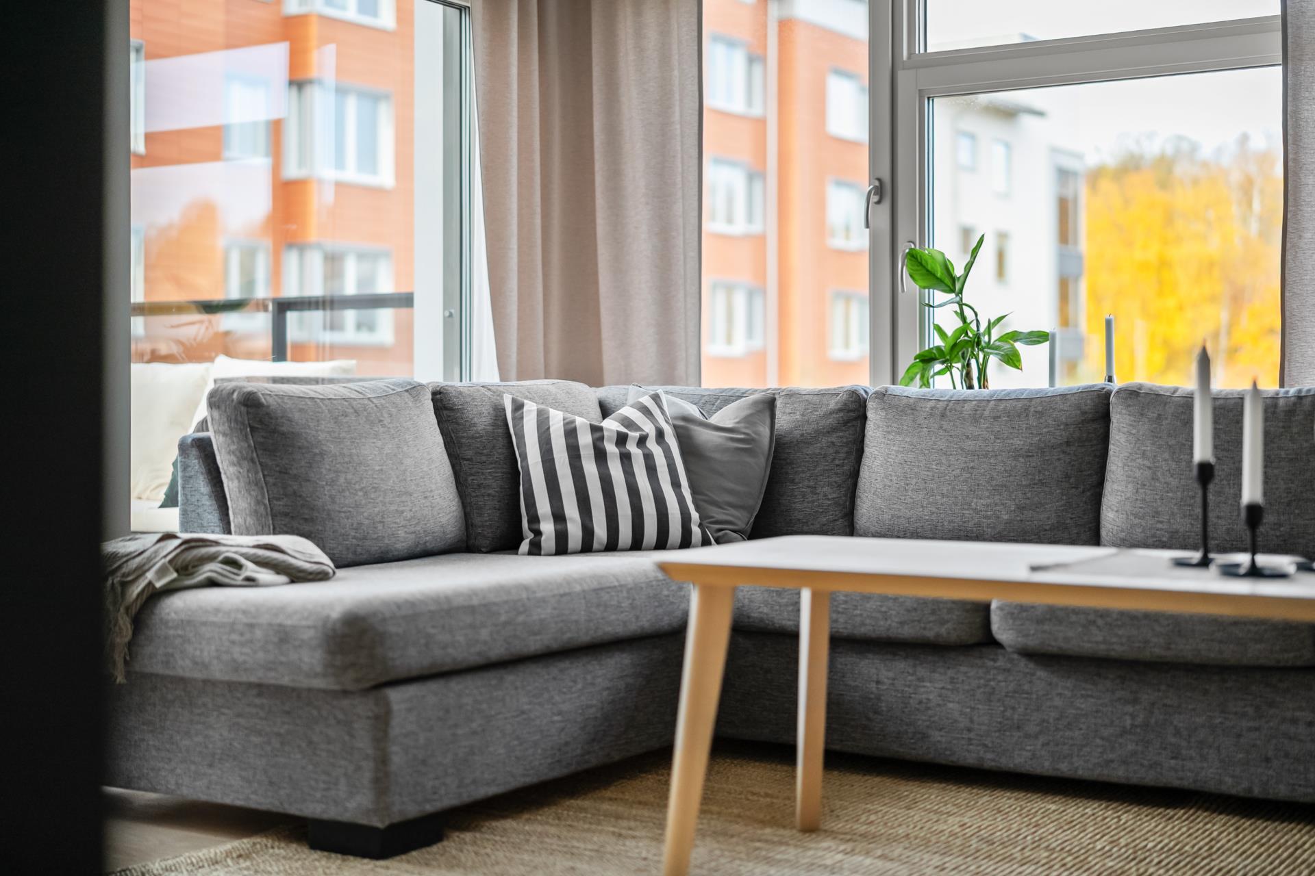 Köket, vardagsrummet och uteplatsen hänger ihop och erbjuder bra sällskapsytor för sociala sammanhang. Stora fina fönster i vinkel ger mycket ljus.