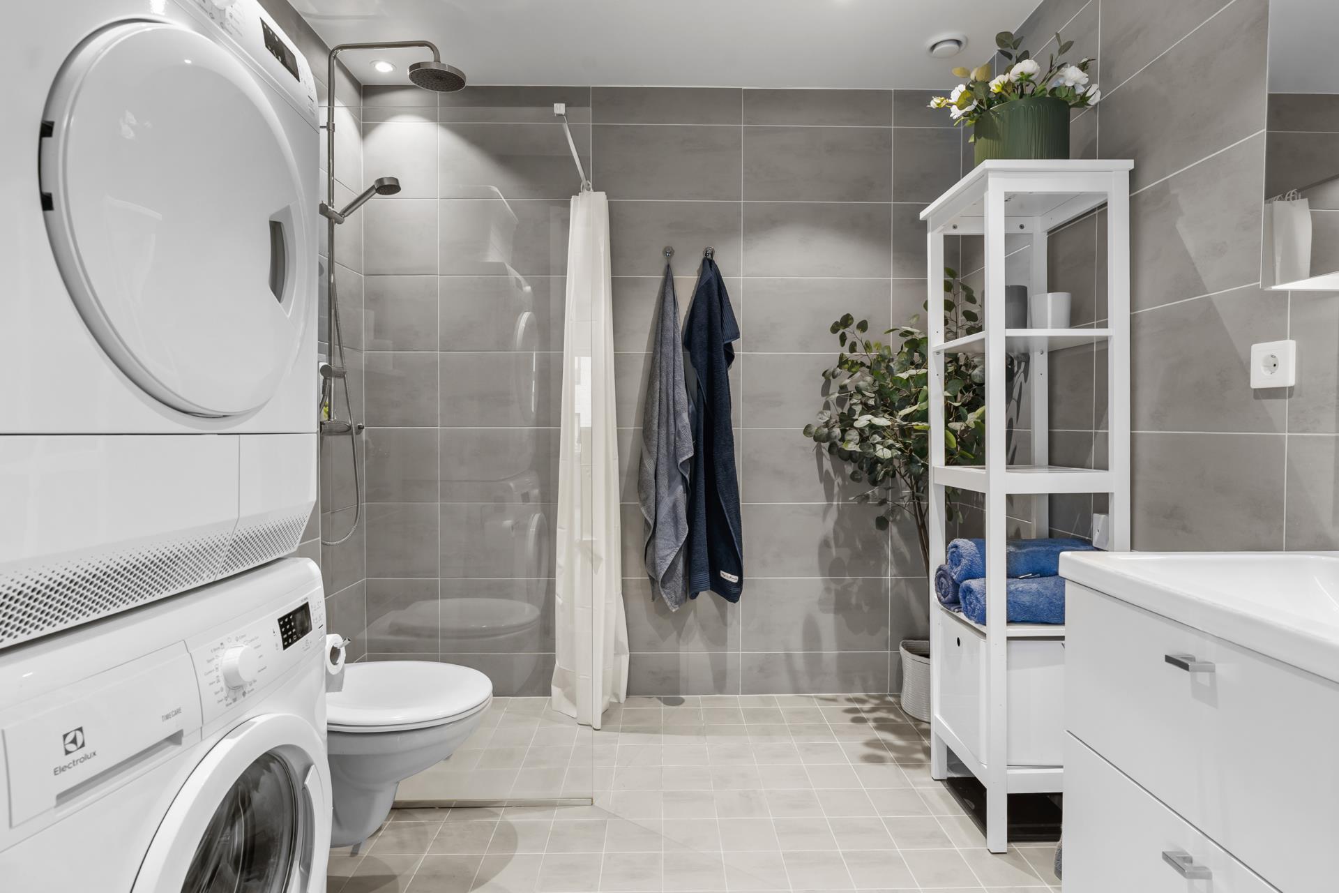Helfräscht badrum med kakel och klinker. Utrustat med dusch, wc, handfat, kommod, badrumsskåp och handdukstork. Lägg därtill tvättmaskin, torktumlare, handfat och golvvärme.