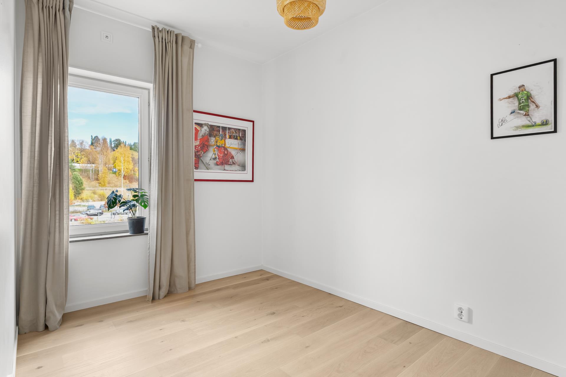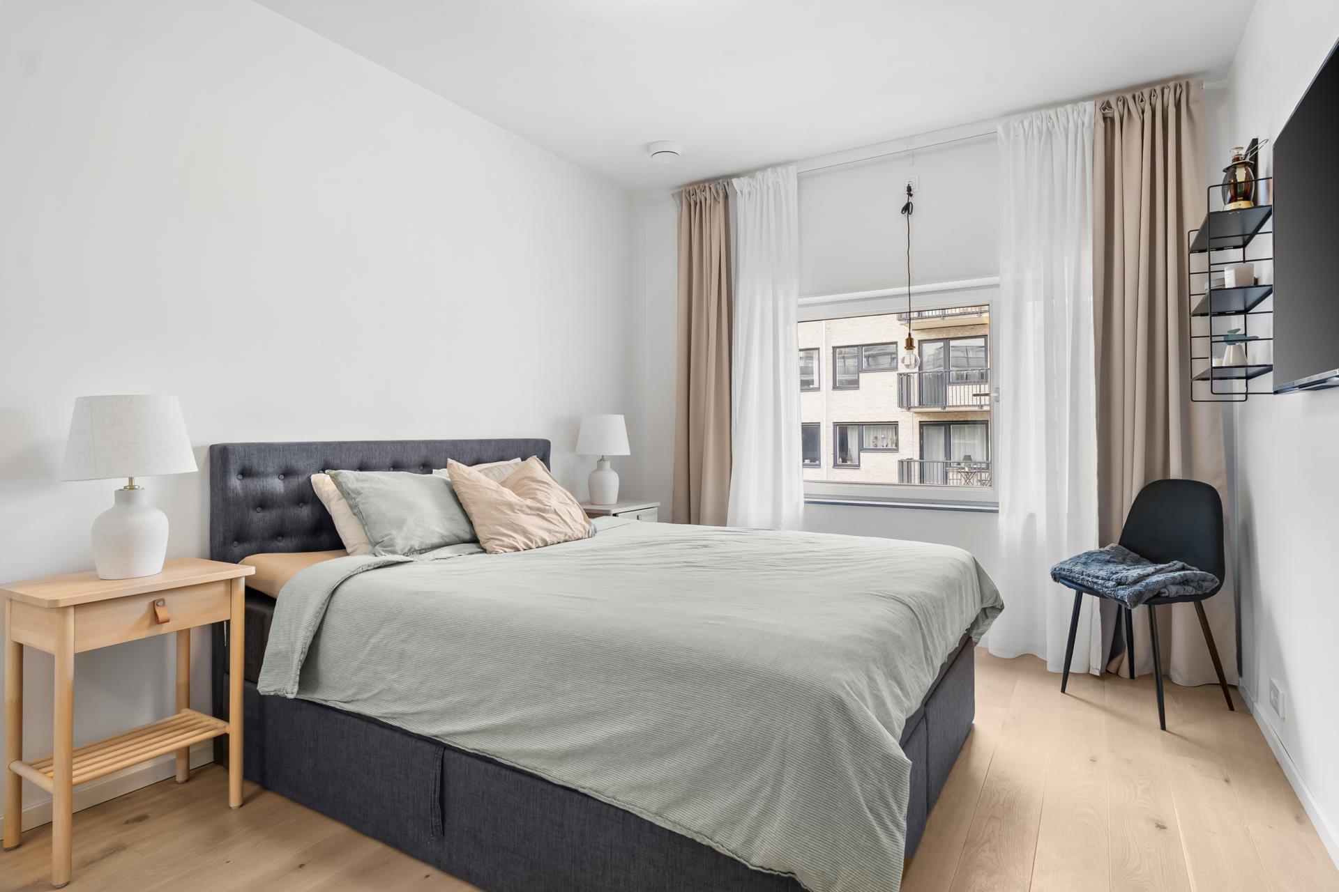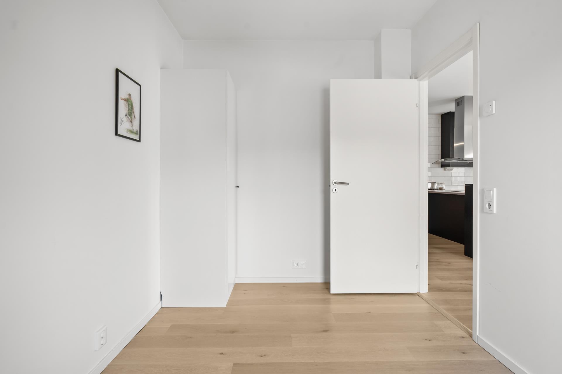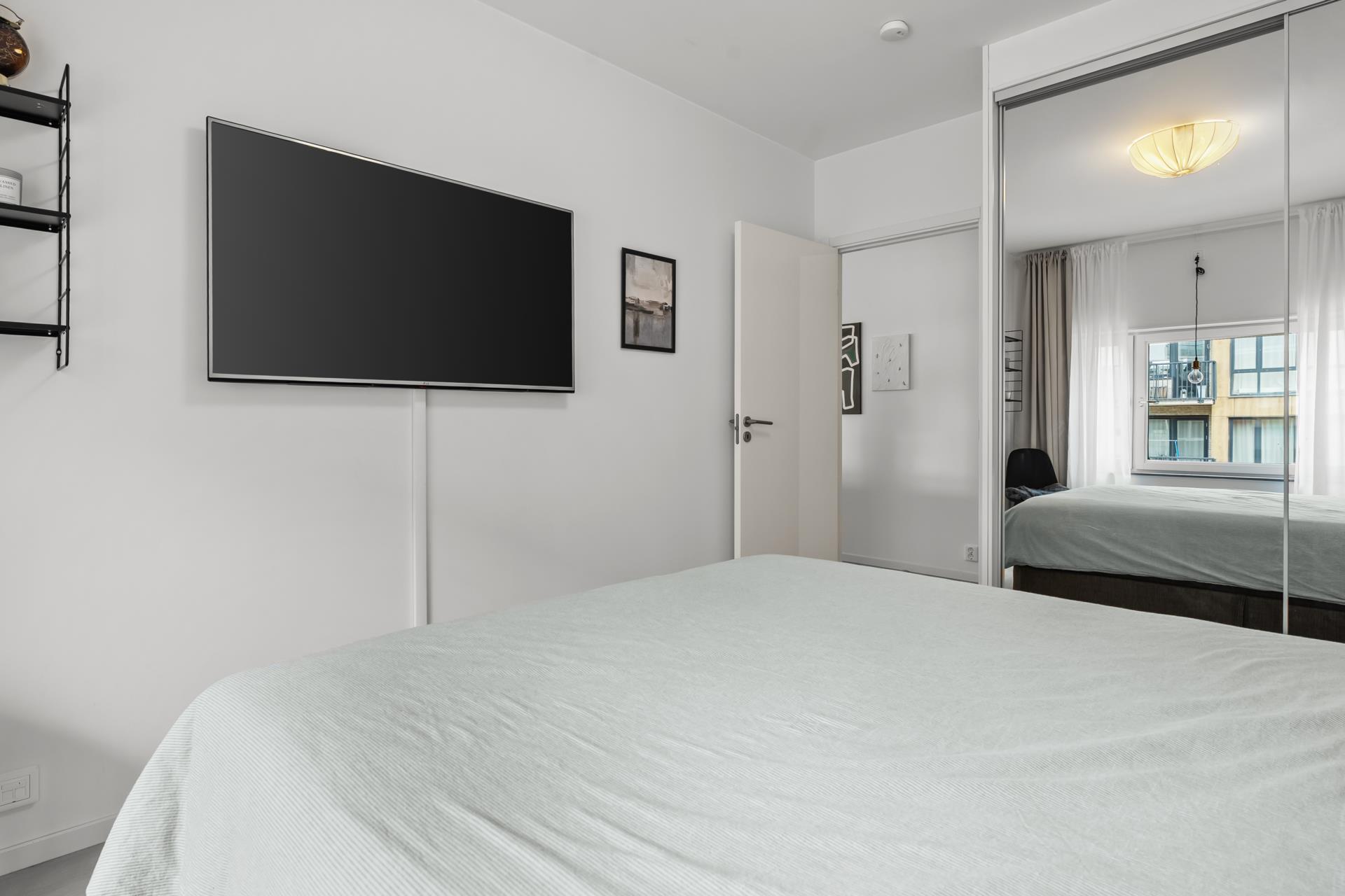 Rymligt sovrum med plats för dubbelsäng. Förvaring i garderober med skjutdörrar.