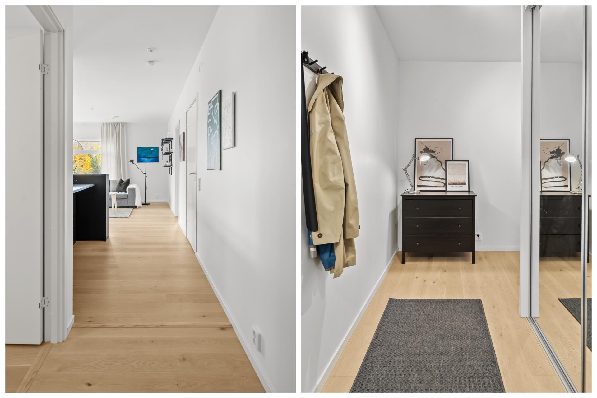 Ljus hall med förvaring i garderob med skjutdörrar och spegelglas. I anslutning till hallen finns ett rymligt förråd.