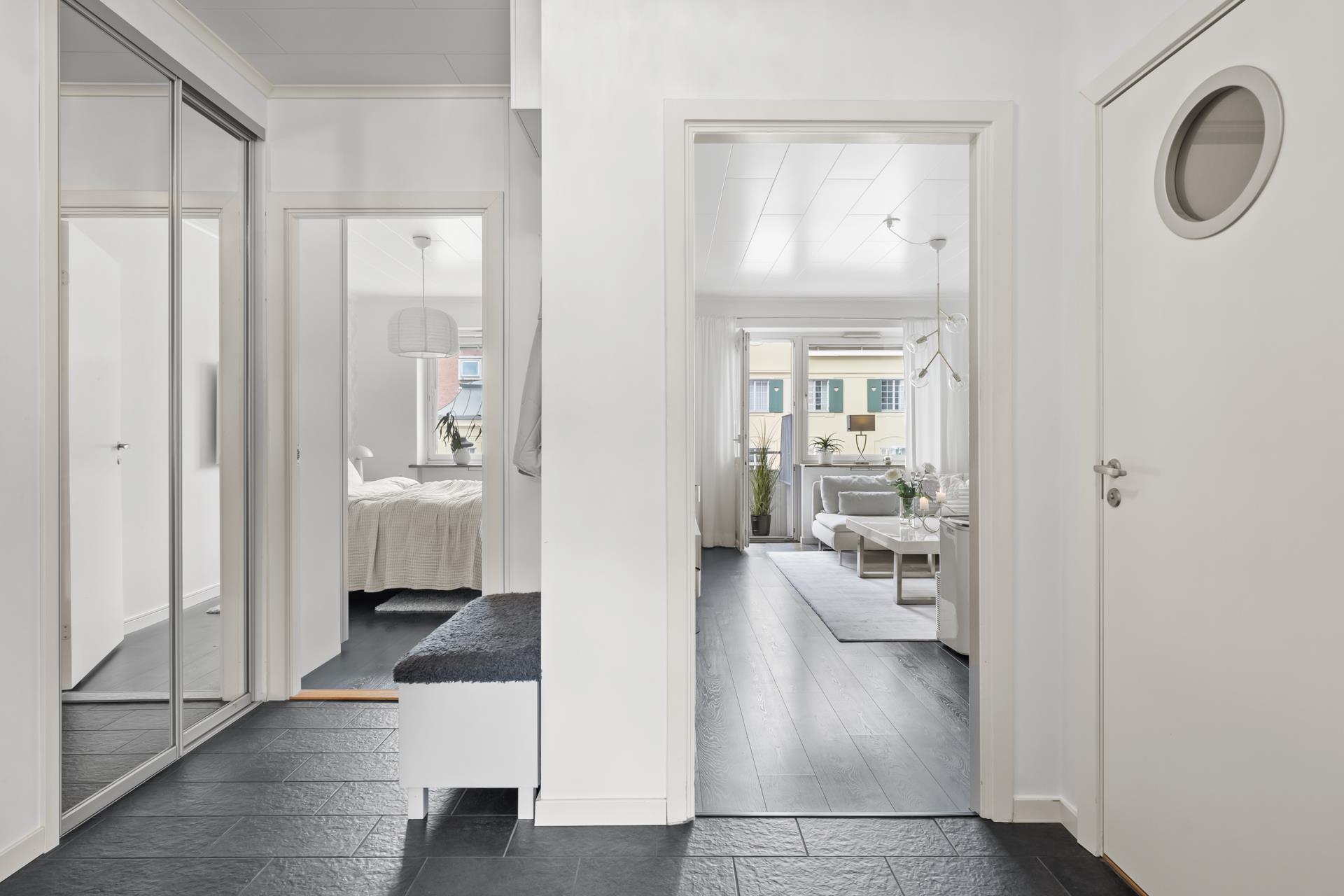 Hall med plats för generös förvaring i garderob med moderna skjutdörrar. Härifrån når du kök, badrum och vardagsrum.