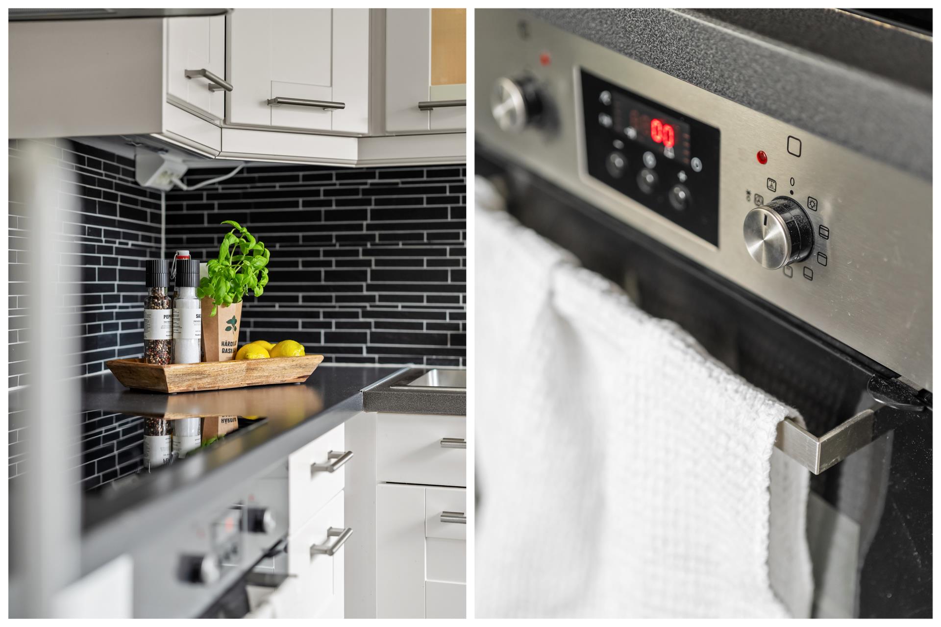 Maskinell utrustning: Induktionshäll, fläkt, ugn, kyl/frys och integrerad diskmaskin.