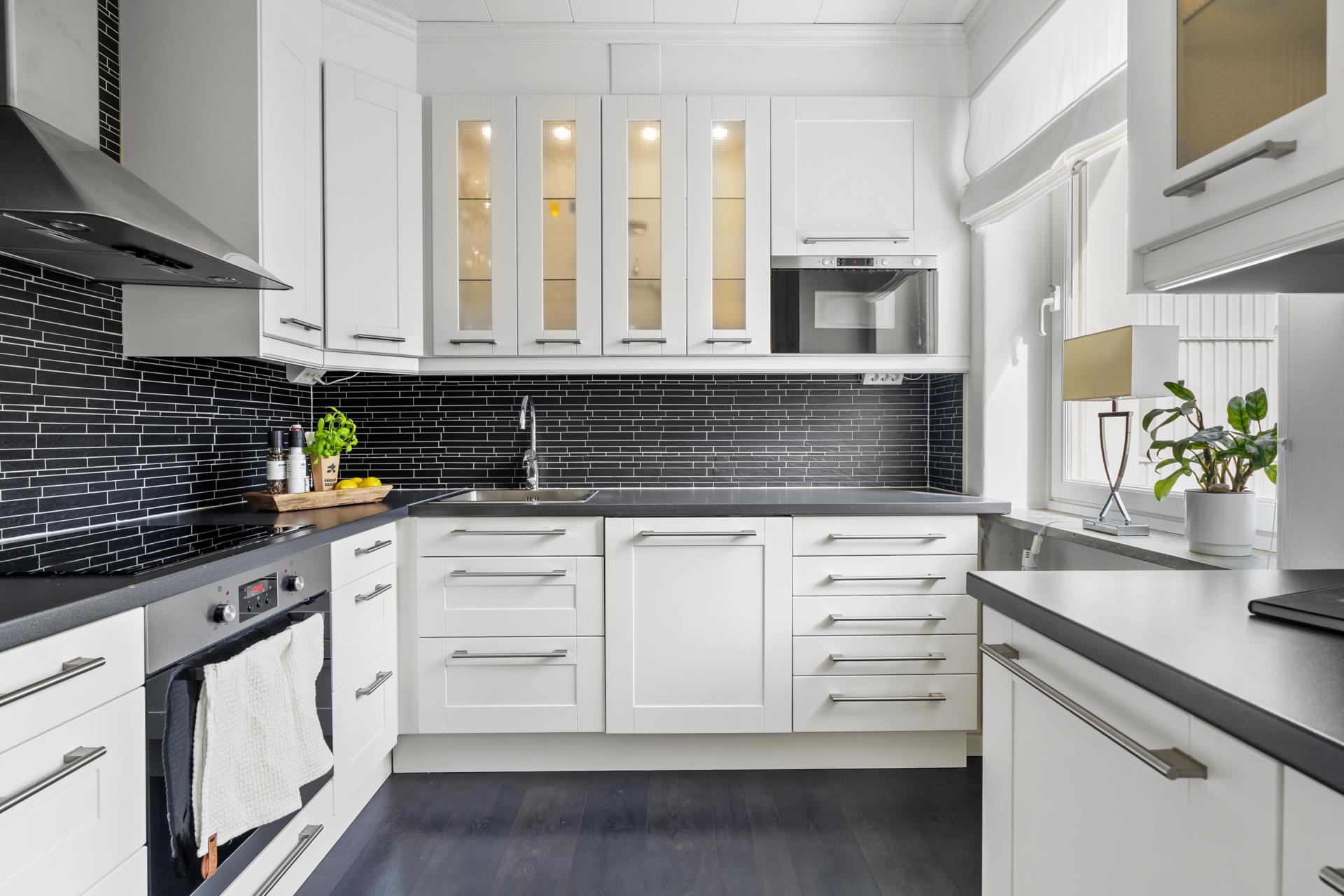 Modernt kök med generöst utrymme för matplats. Vita luckor och lådor med bra förvaring. Arbetsbänk som bjuder in till matlagning.