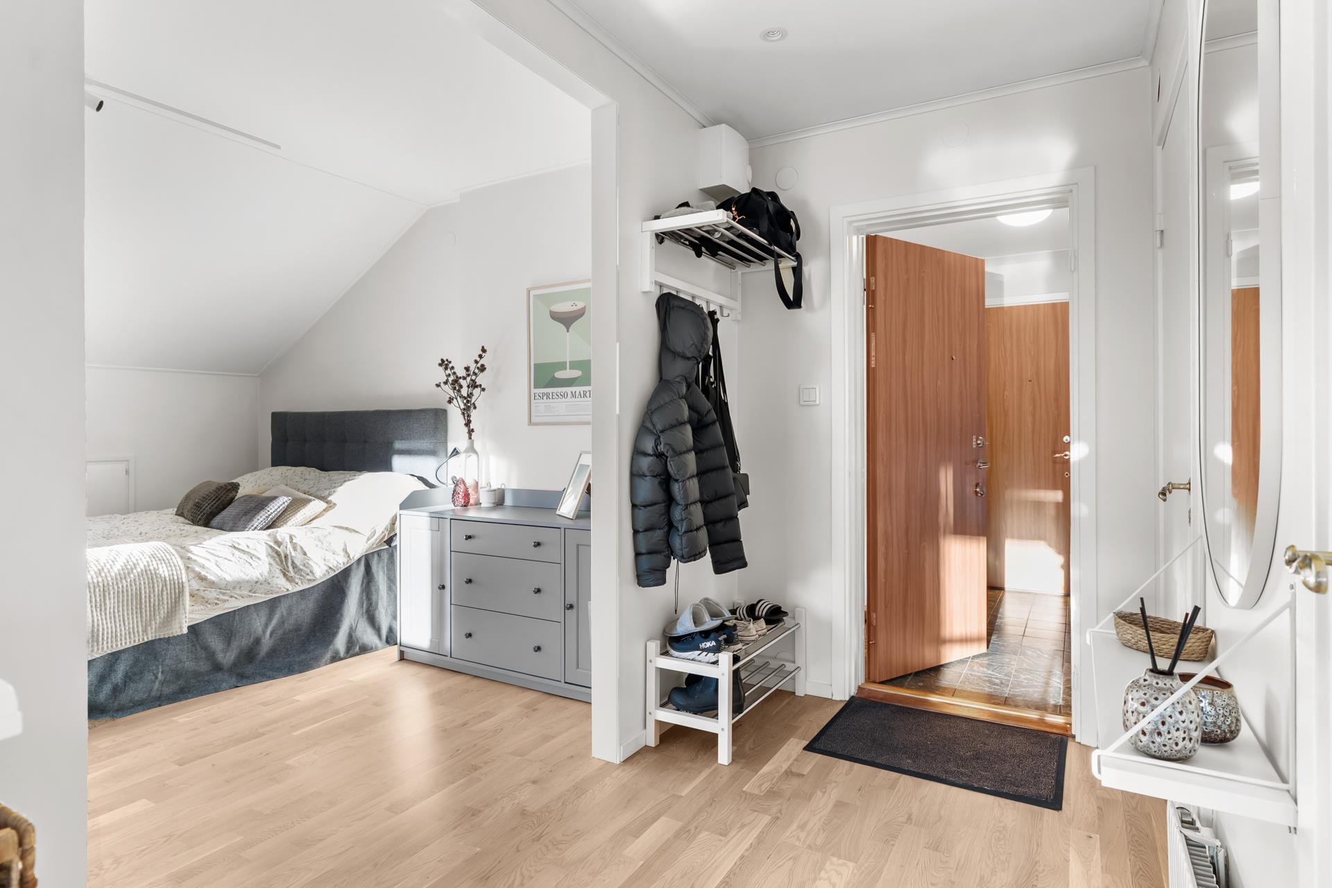 När du kliver in möts du av en välkomnande hall med god förvaring i klädkammare. Rakt fram öppnar ett fräscht och ljust kök upp sig, med plats för matbord och generösa förvaringsmöjligheter. Det rymliga allrummet erbjuder gott om plats för både soffgrupp och säng, och präglas av ett härligt ljusinsläpp från stora fönsterpartier och den franska balkongen som ger en luftig och exklusiv känsla. Helkaklat badrum med golvvärme, utrustat med wc, handfat, dusch och tvättmaskin. I hela lägenheten finns ny el samt ett modernt och smart belysningssystem.