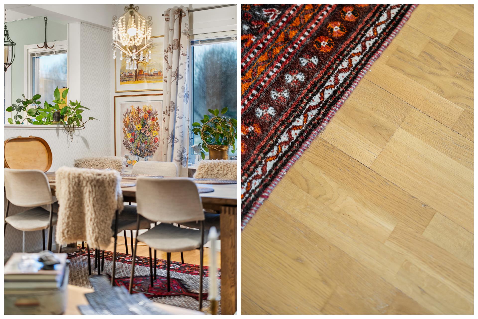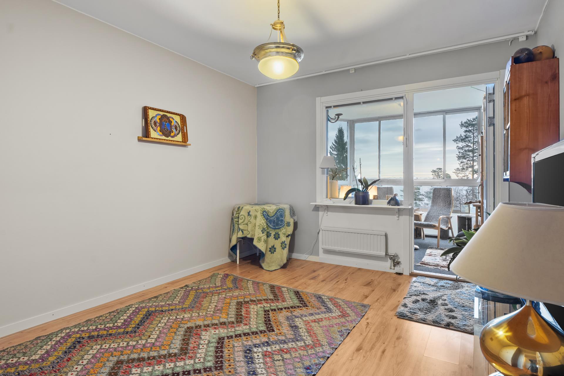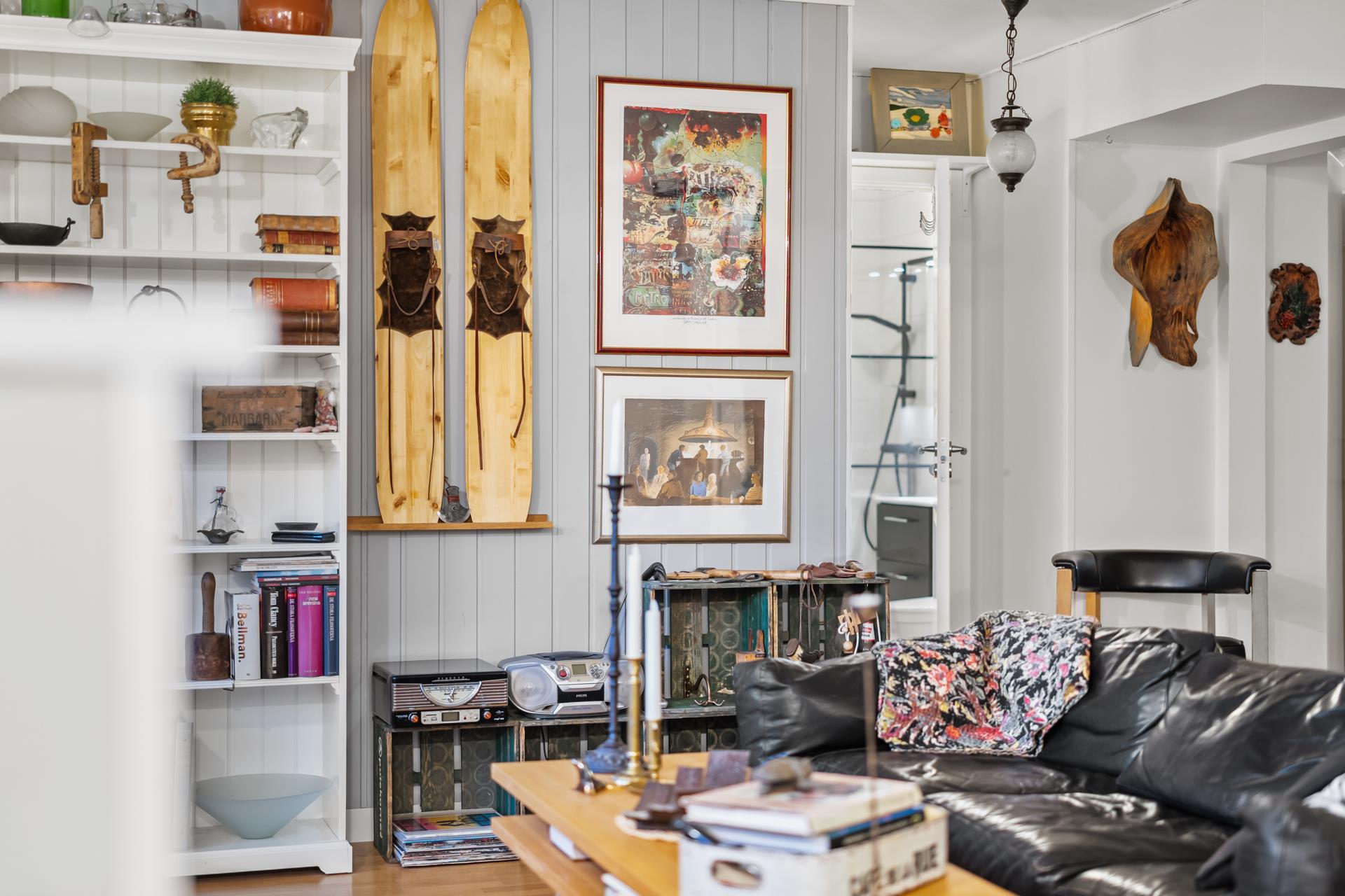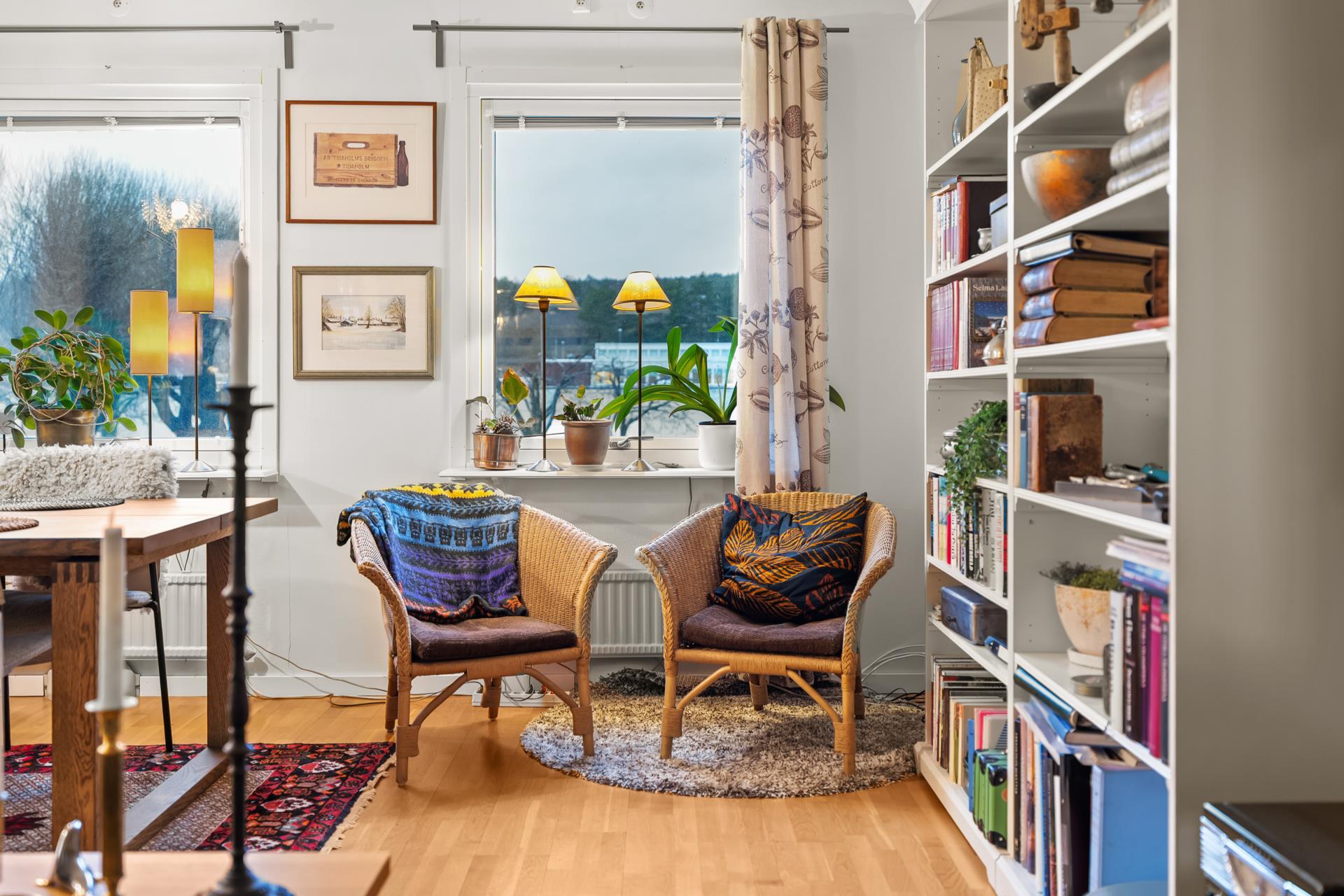 Luftigt allrum med öppen planlösning mot kök. Parkettgolv och målade väggar.