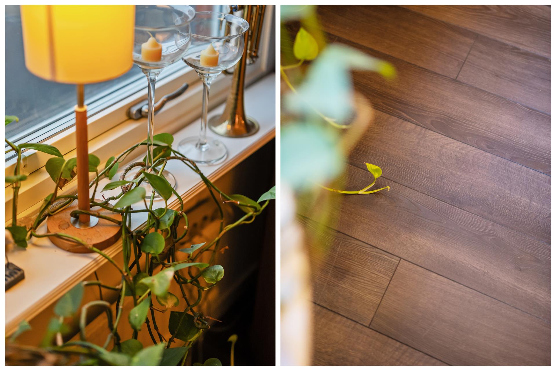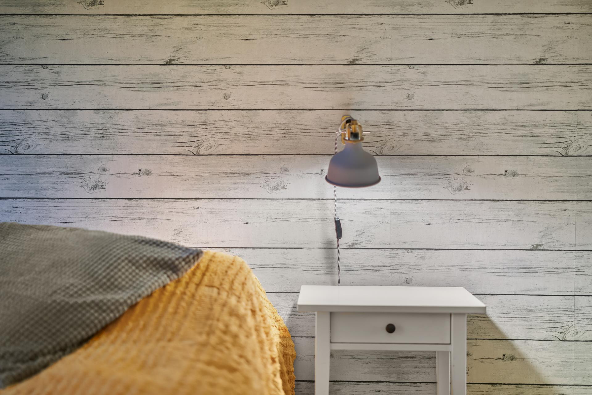 Med plats för dubbelsäng. Laminatgolv och målade väggar samt fondtapet.