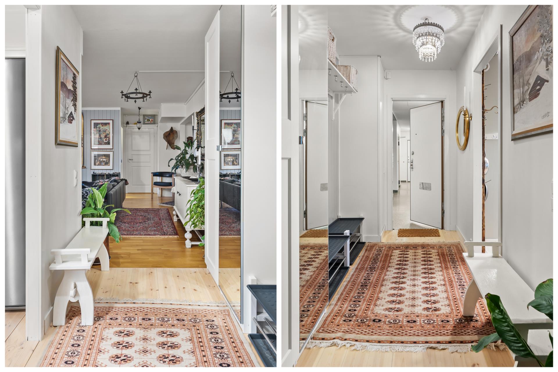 Välkomnande hall med plats för ytterkläder. Garderober med förvaringsmöjligheter.