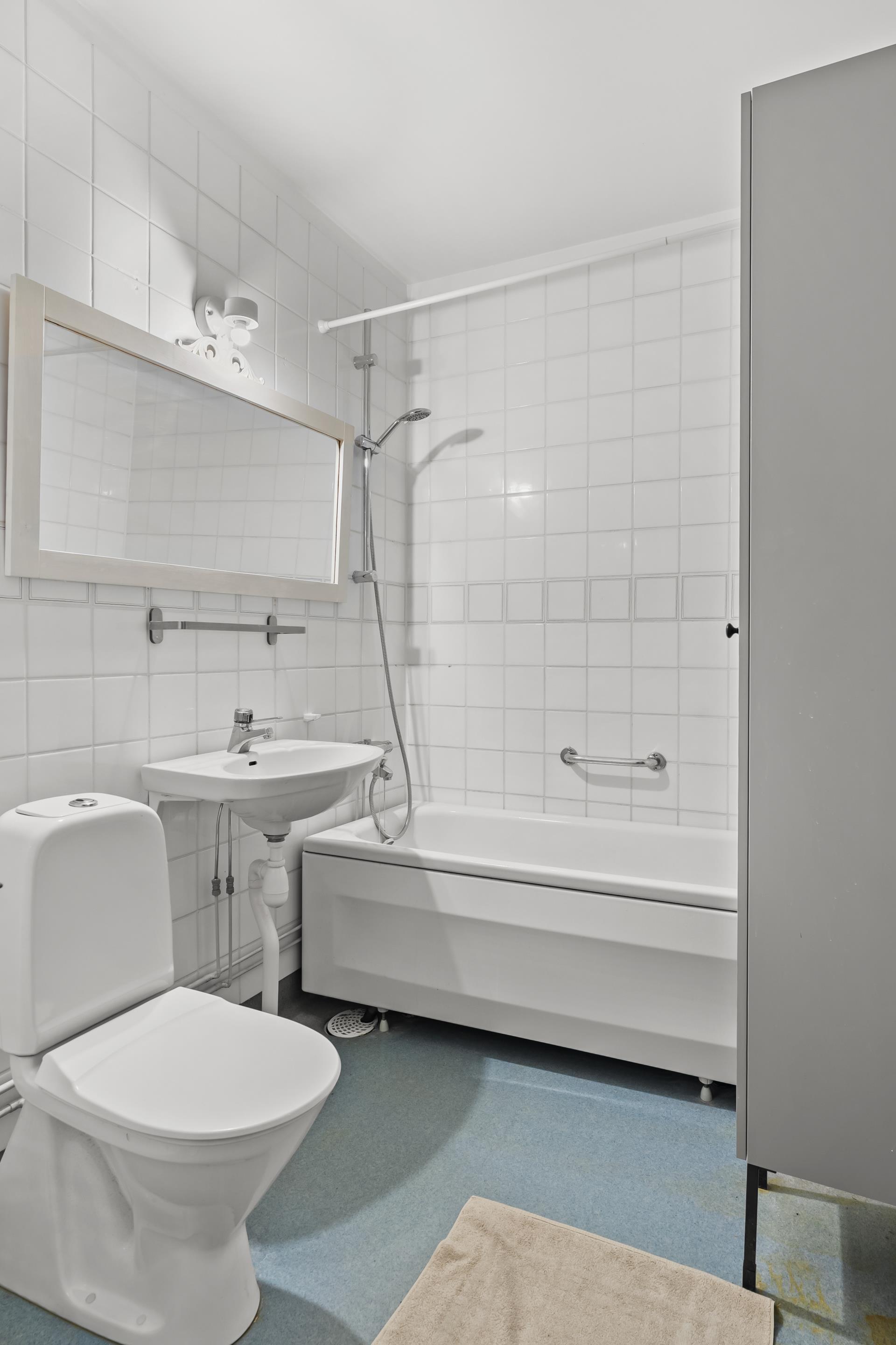 Badrum med våtrumsmatta och kaklade väggar. Utrustat med badkar, wc och handfat.