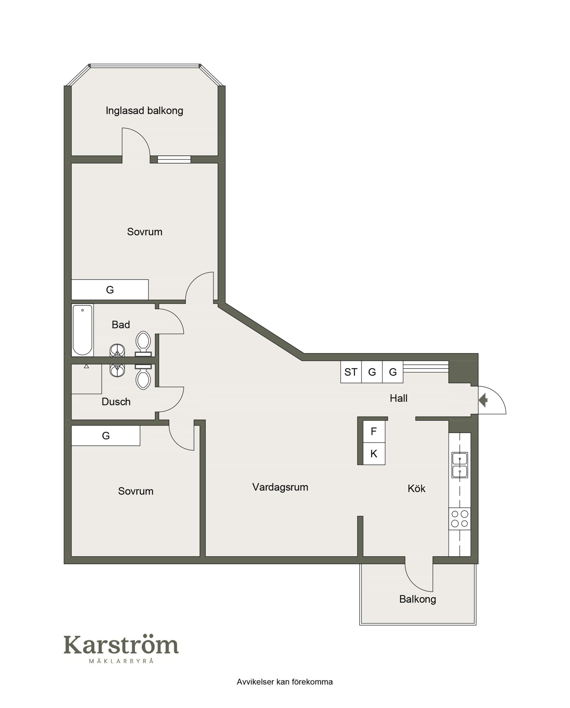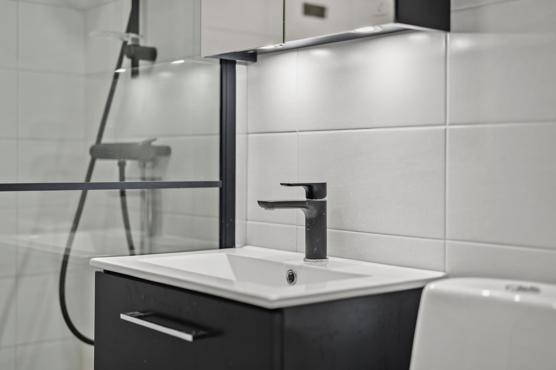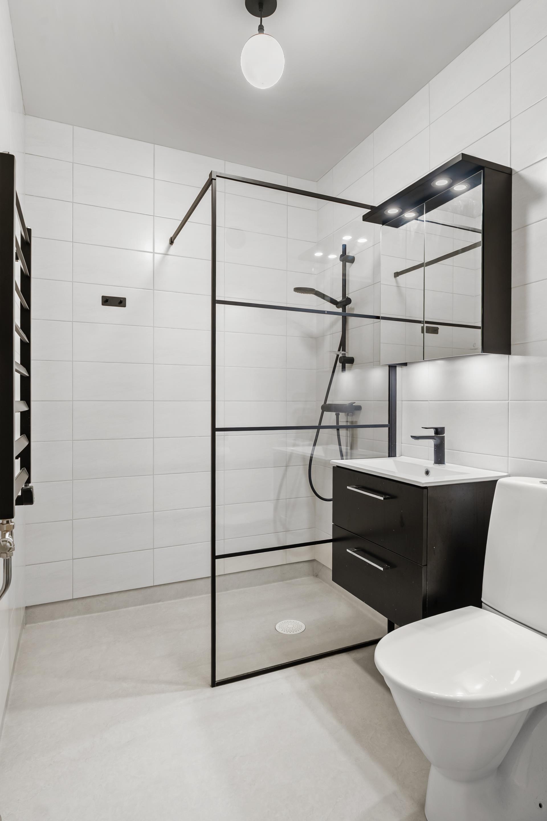 Badrum renoverat 2021 med smakfulla val av våtrumsmatta och kaklade väggar. Utrustat med dusch med glasvägg, wc, handdukstork och tvättställ.