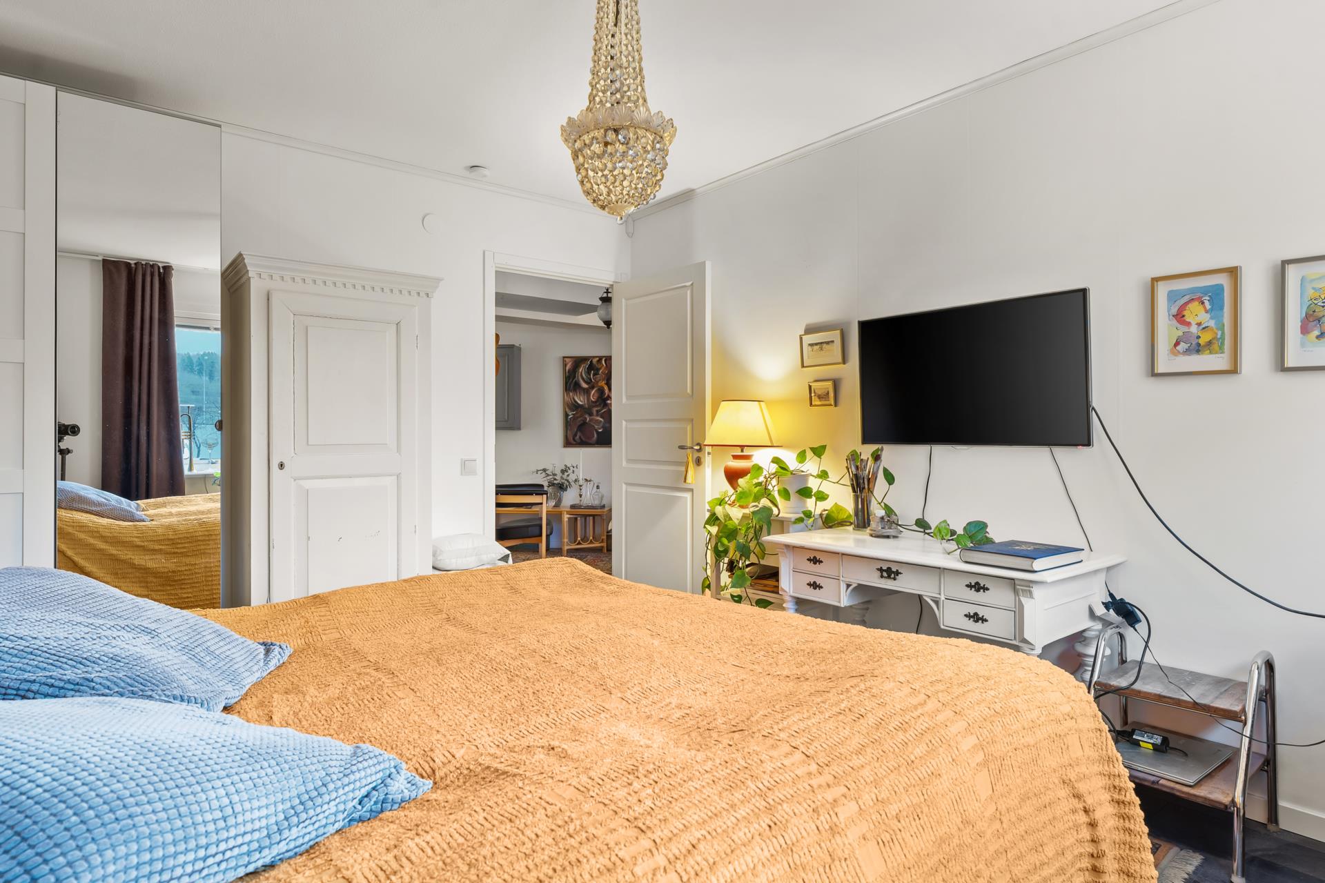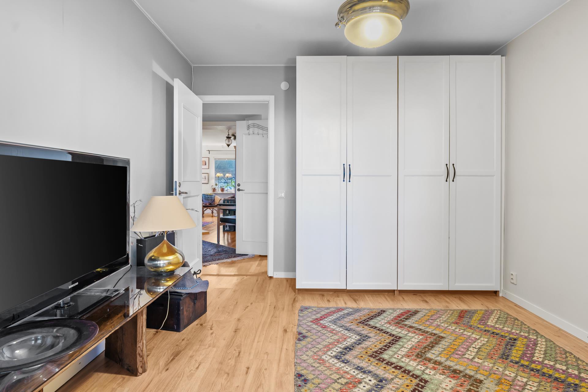 Rymligt sovrum med plats för dubbelsäng. Förvaring i garderob.