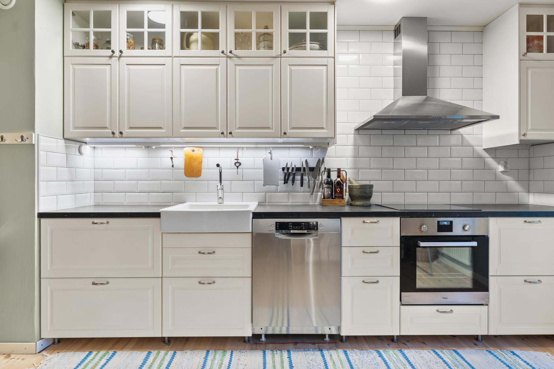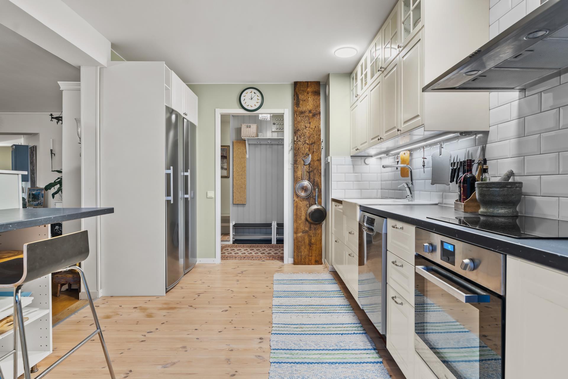 Kök är smakfullt renoverat och har matplats invid fönster. Bra arbetsytor och stilfulla detaljer. Köksinredningen består av stor kyl, stor frys, fläkt, spis och diskmaskin.