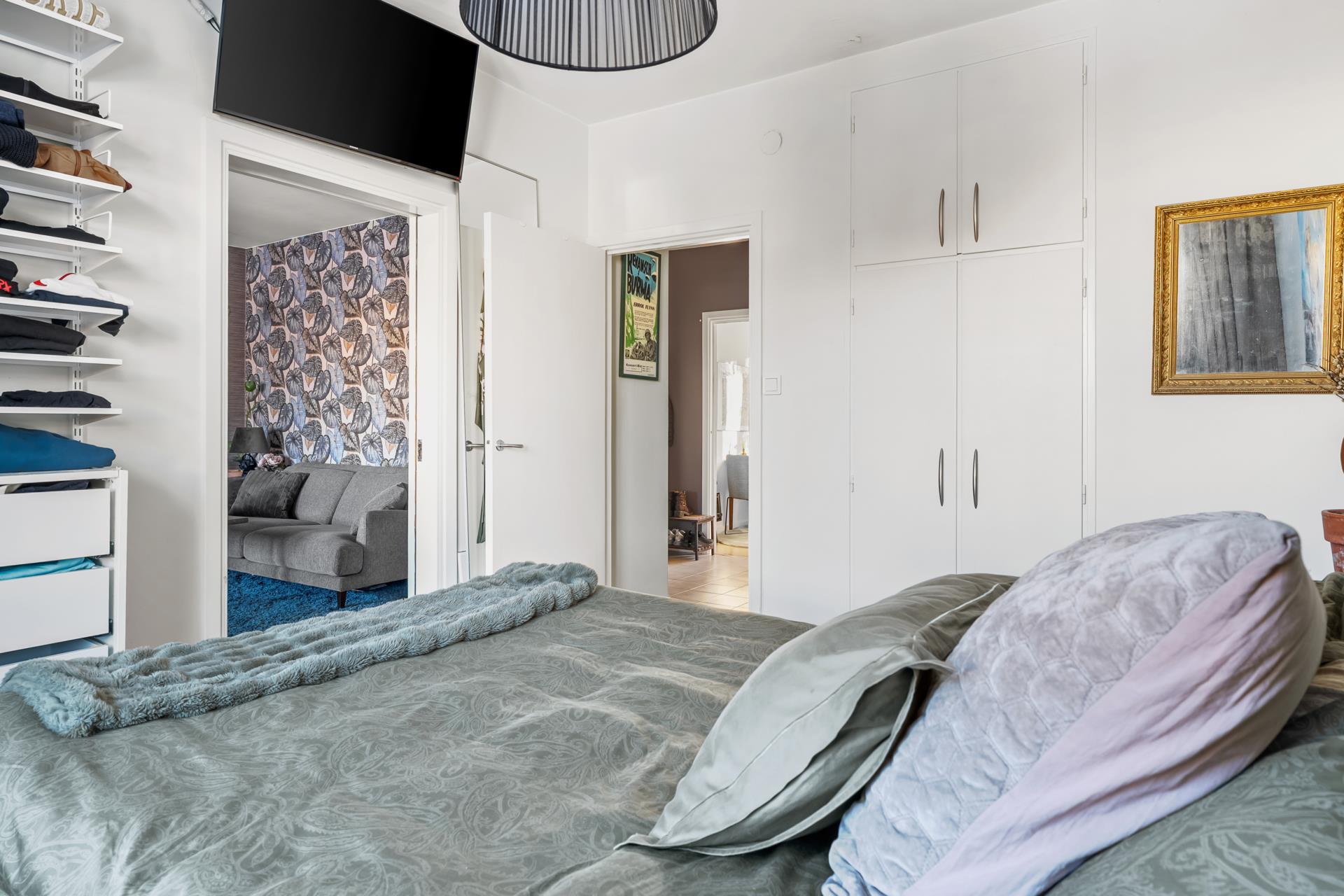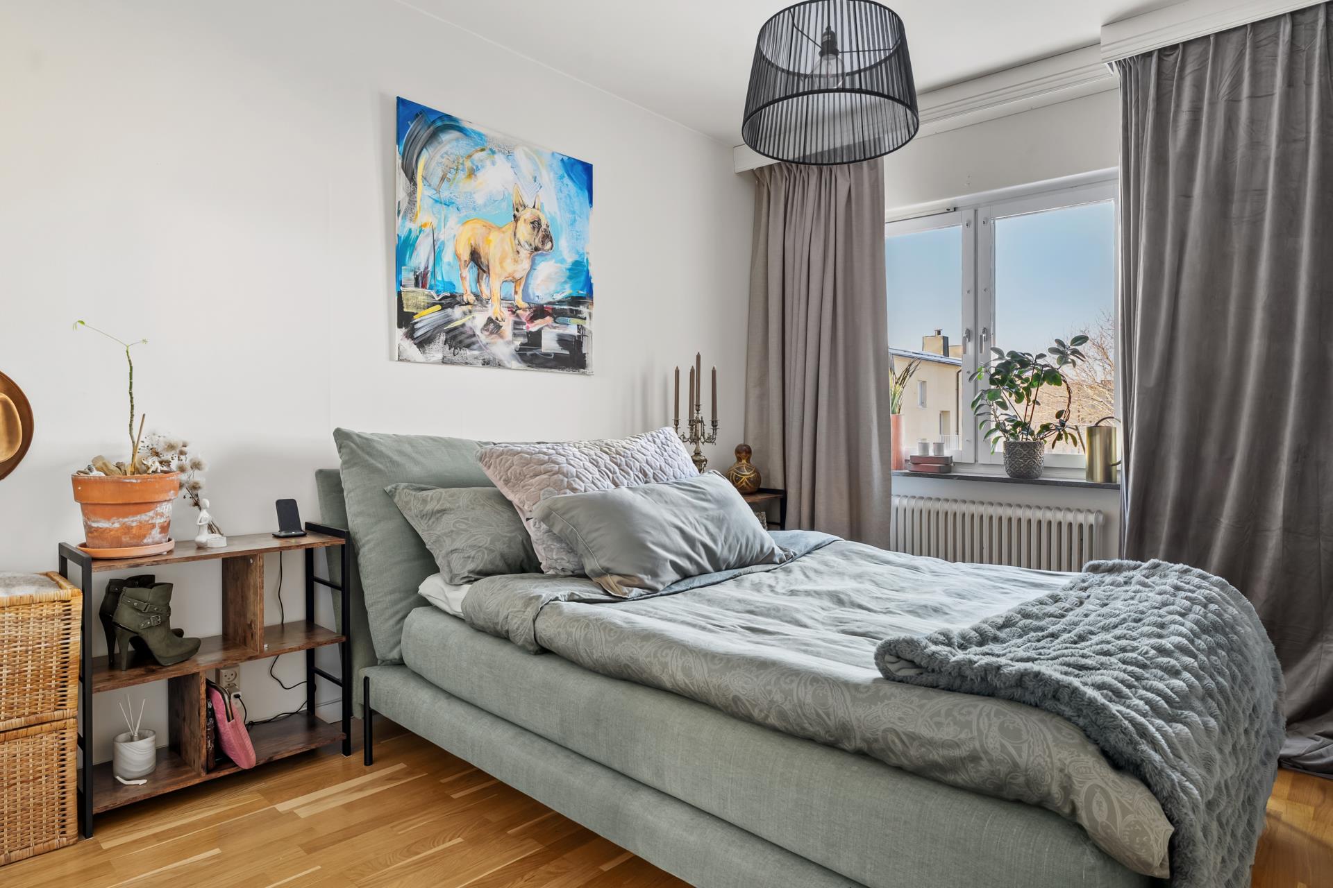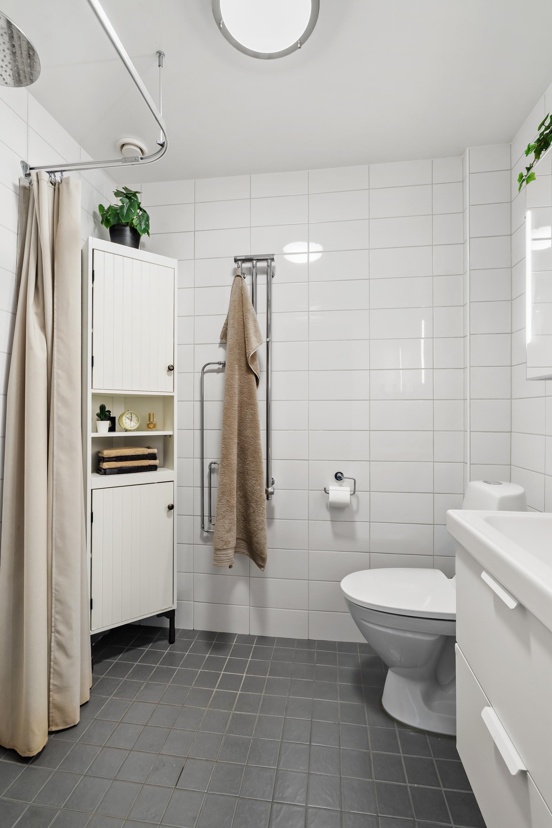 Sovrummet är rofyllt och erbjuder bra förvaring, och badrummet är stilrent utfört med helkaklade ytor.