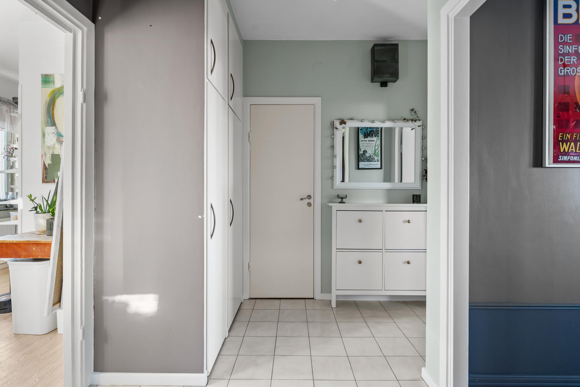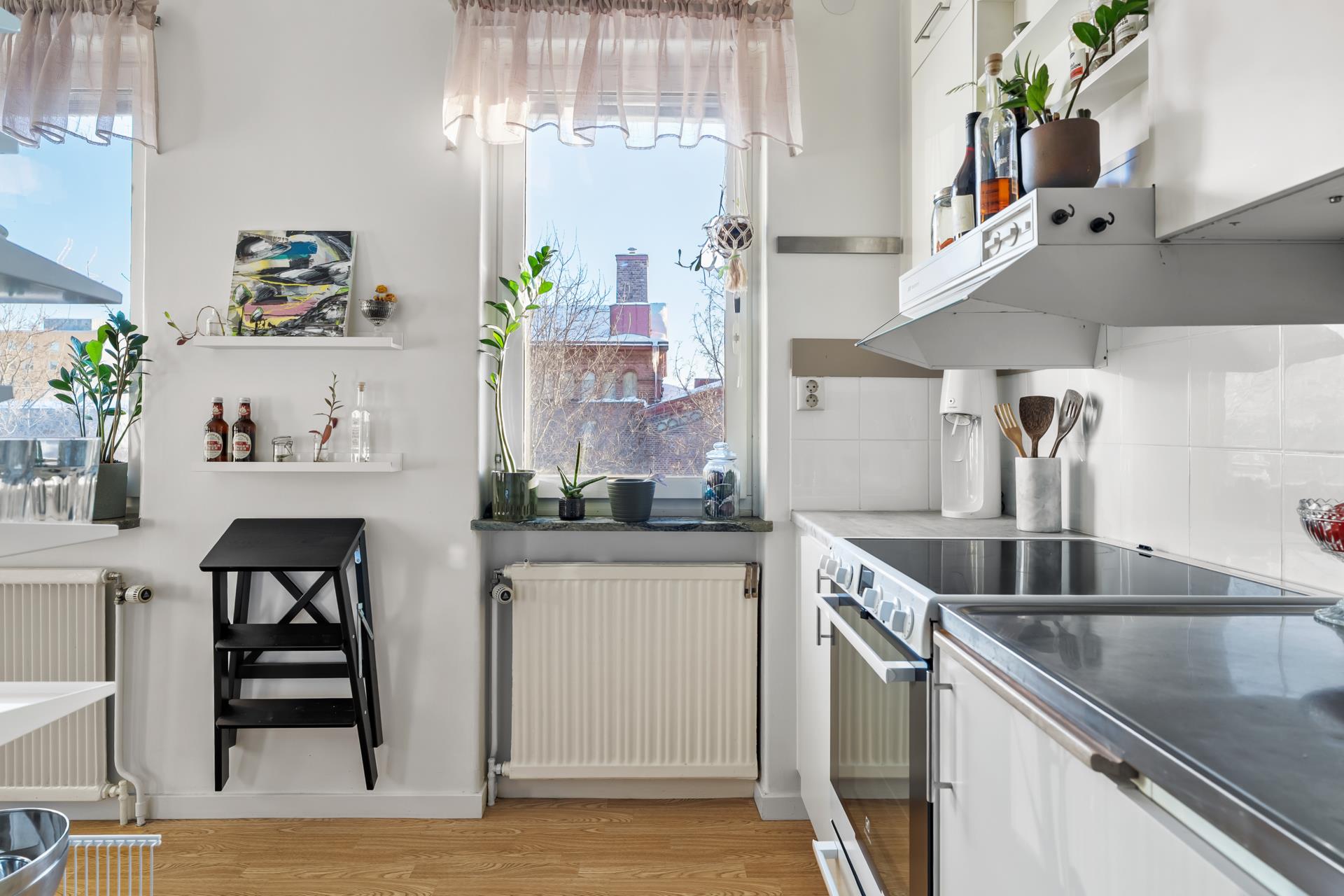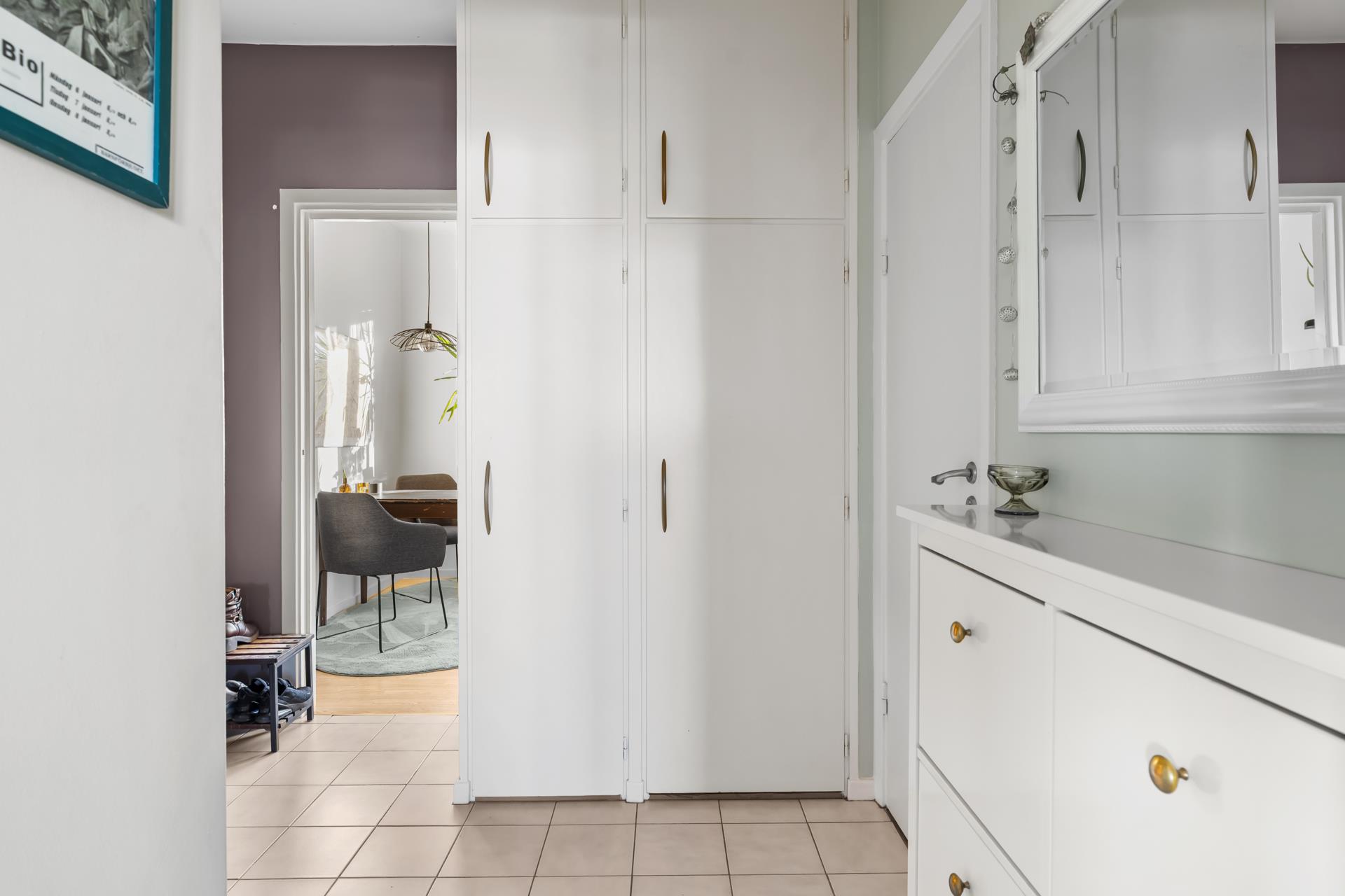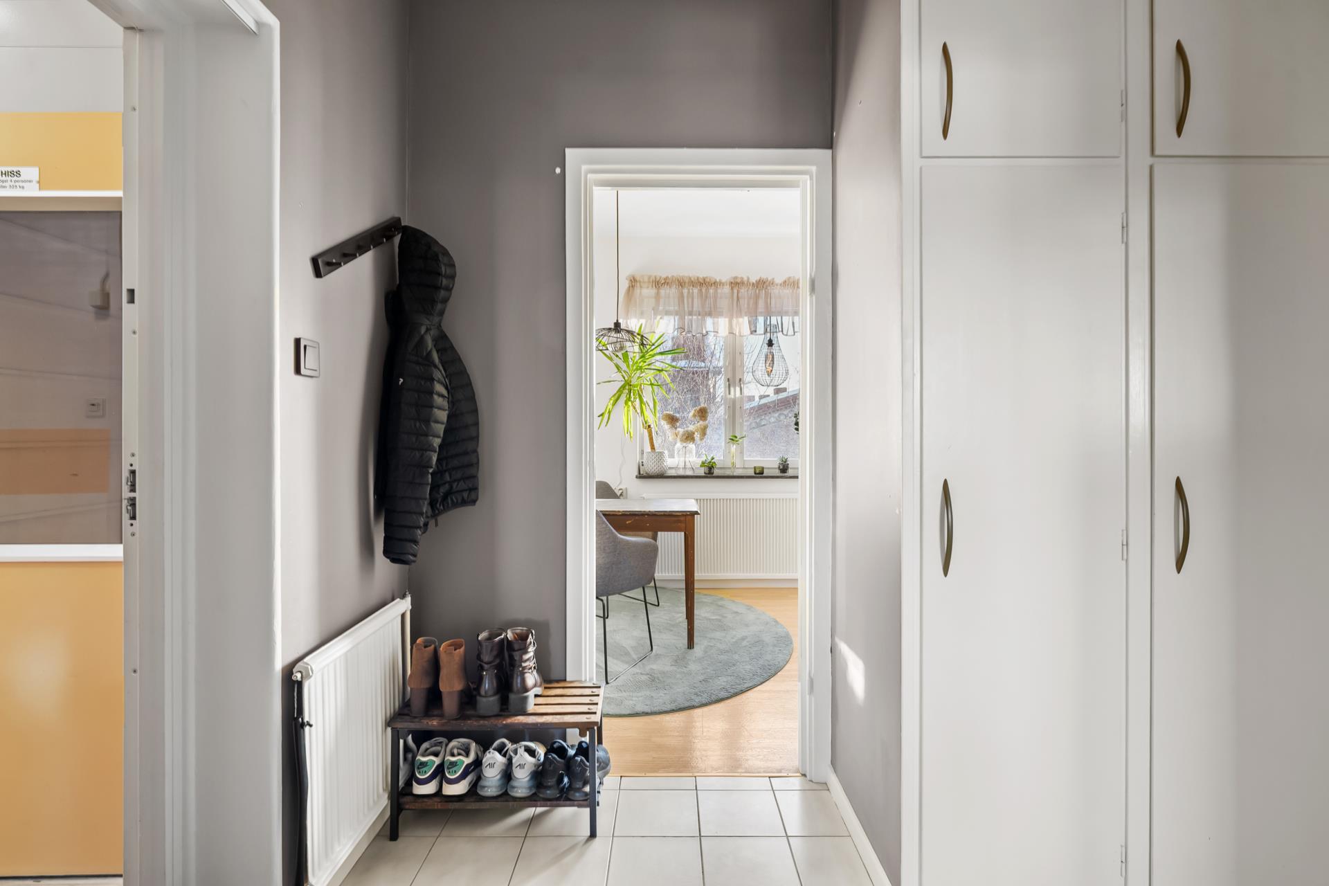 Bostaden öppnar upp med en rymlig hall som erbjuder goda förvaringsmöjligheter. Köket är smart planerat i vinkel och har fint ljusinsläpp samt gott om plats för matbord. Vardagsrummet är lättmöblerat och ger utrymme för både soffhörna och matplats. Härifrån når du den inglasade balkongen med utsikt mot den lugna innergården.