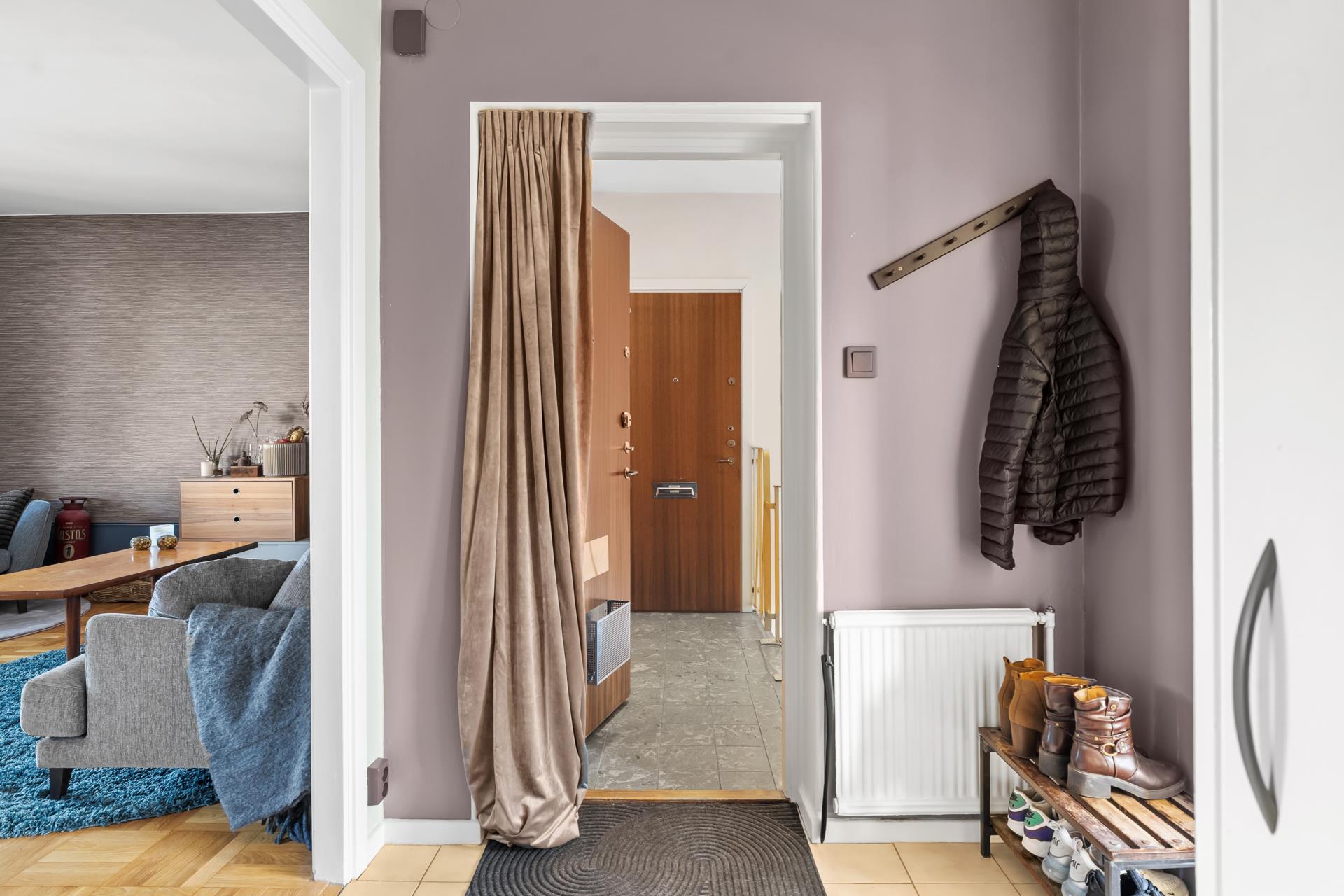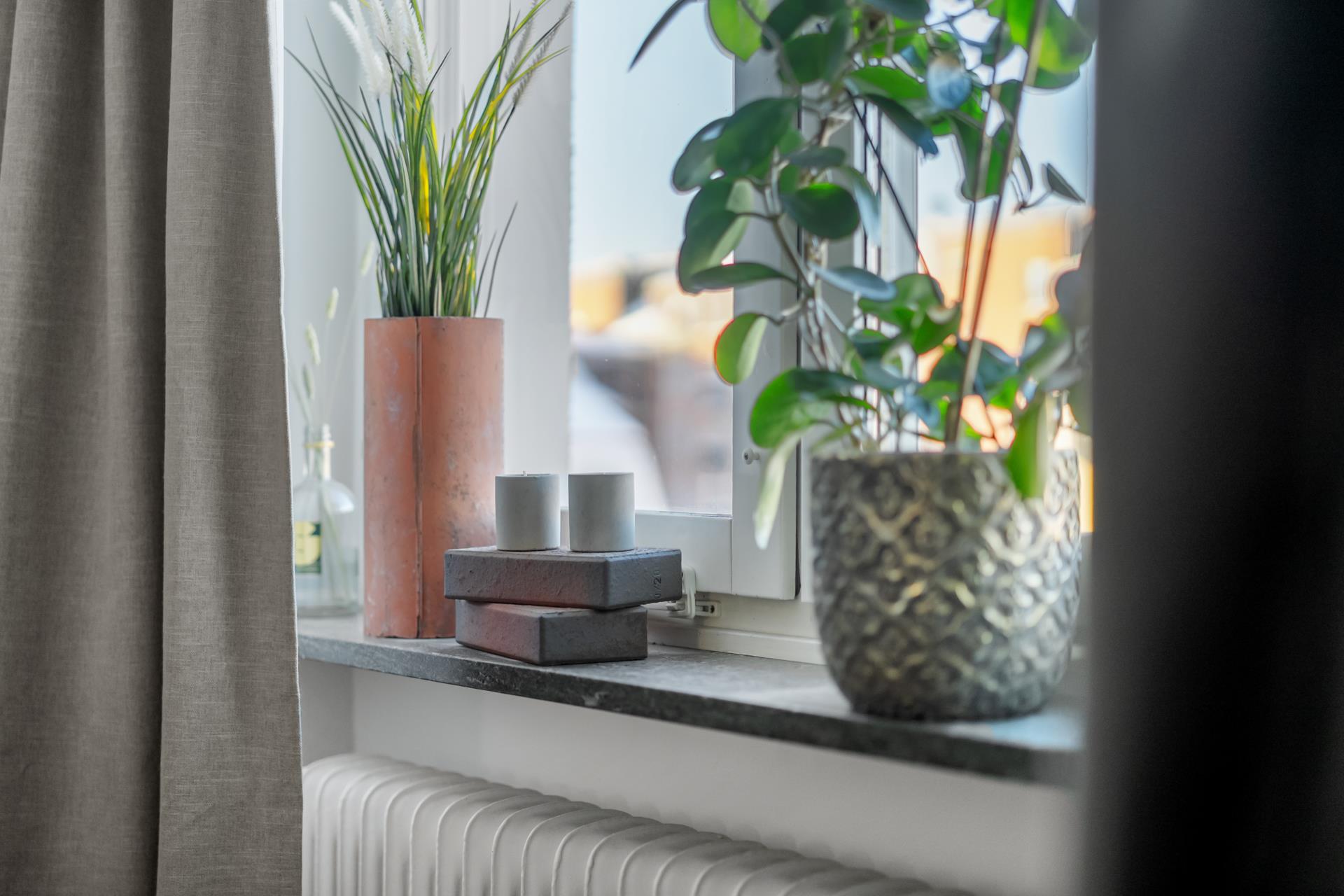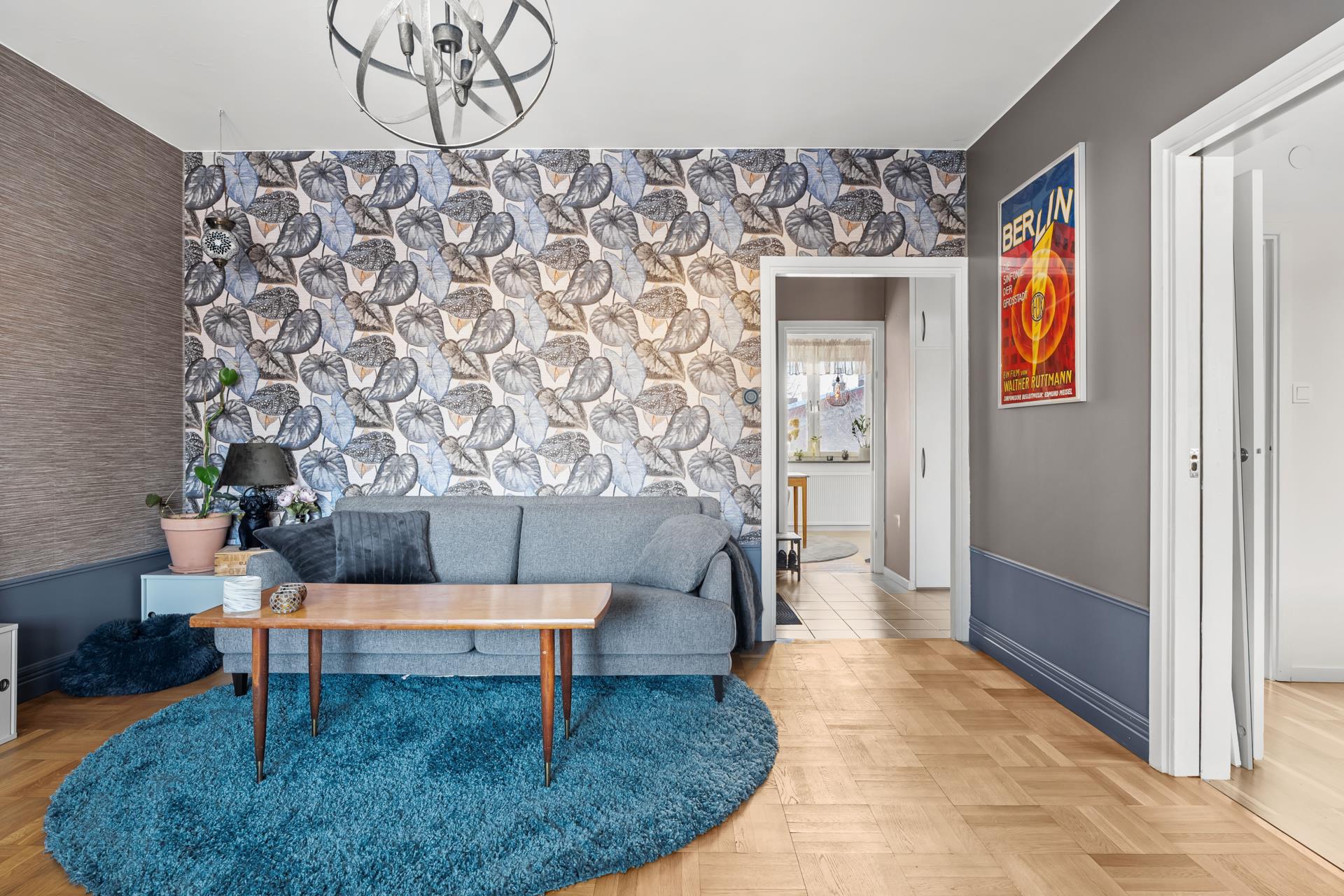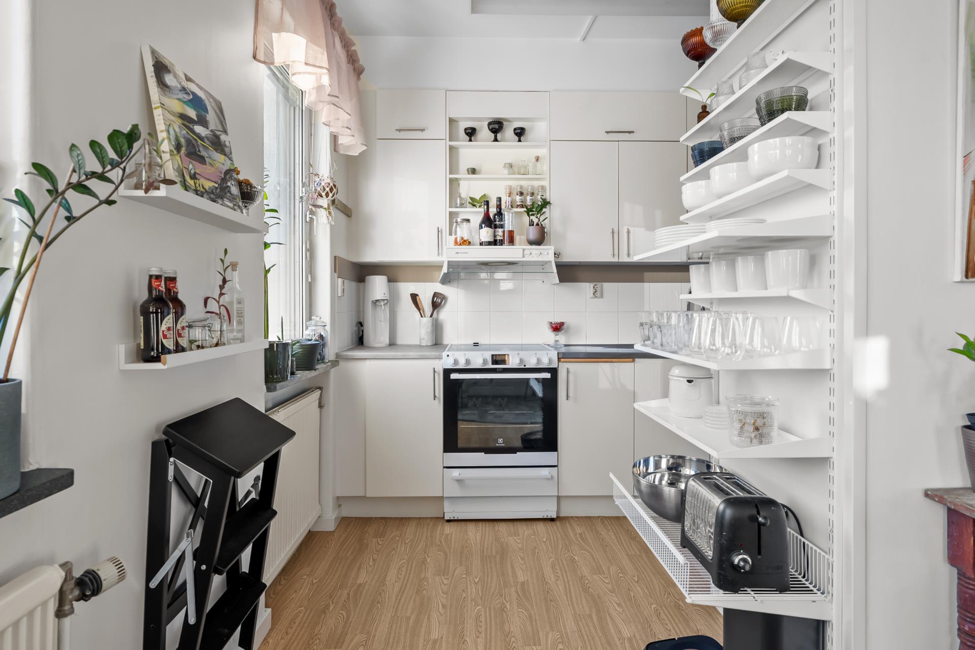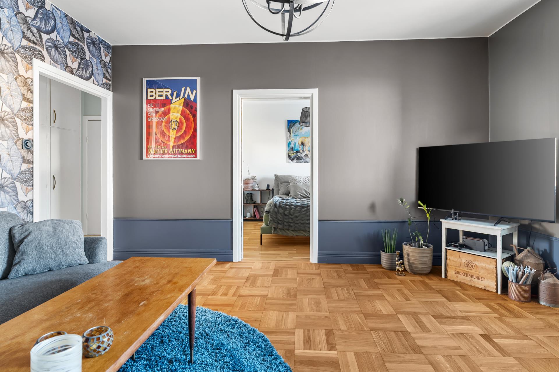 Bostaden öppnar upp med en rymlig hall som erbjuder goda förvaringsmöjligheter. Köket är smart planerat i vinkel och har fint ljusinsläpp samt gott om plats för matbord. Vardagsrummet är lättmöblerat och ger utrymme för både soffhörna och matplats. Härifrån når du den inglasade balkongen med utsikt mot den lugna innergården.