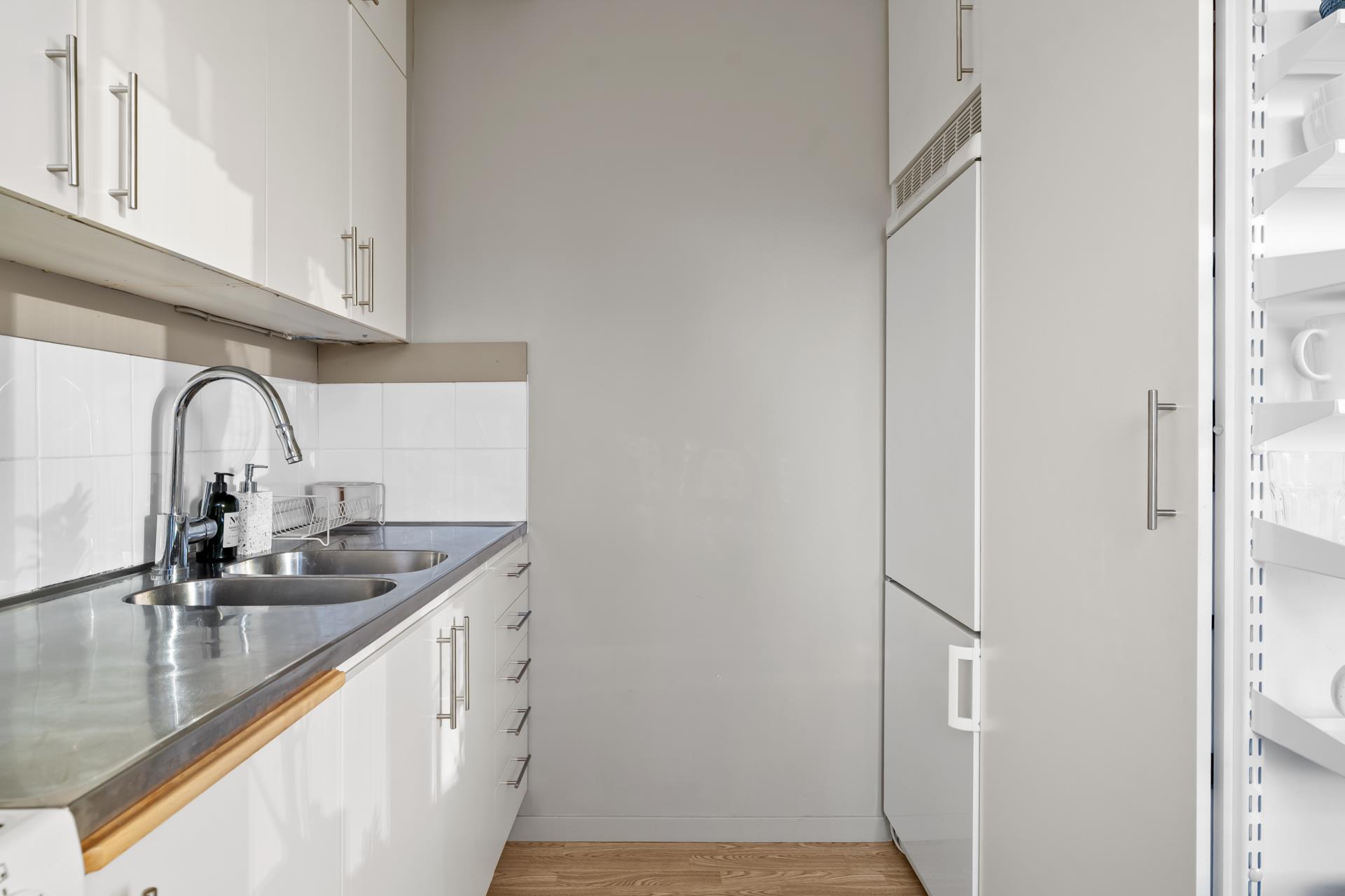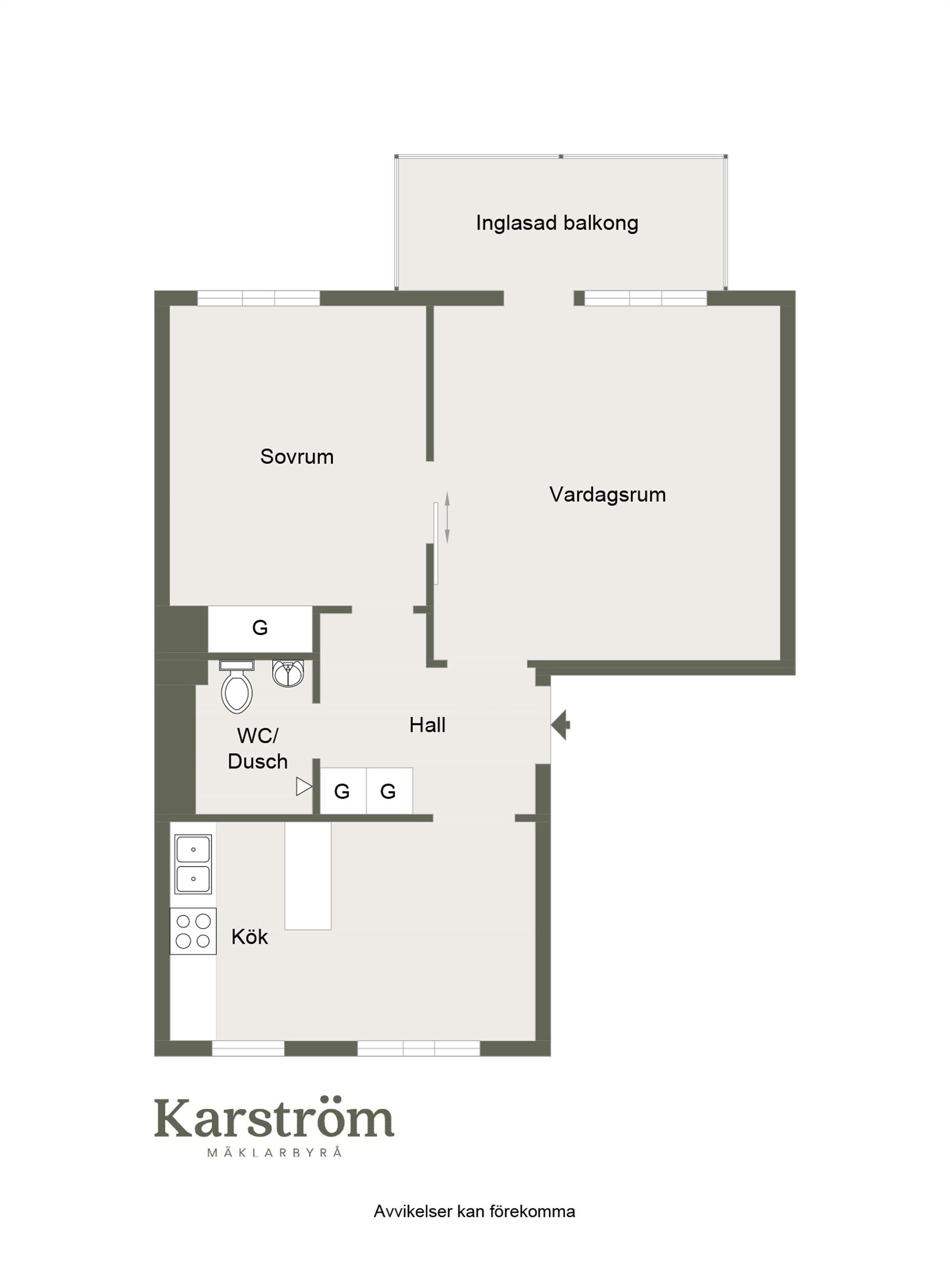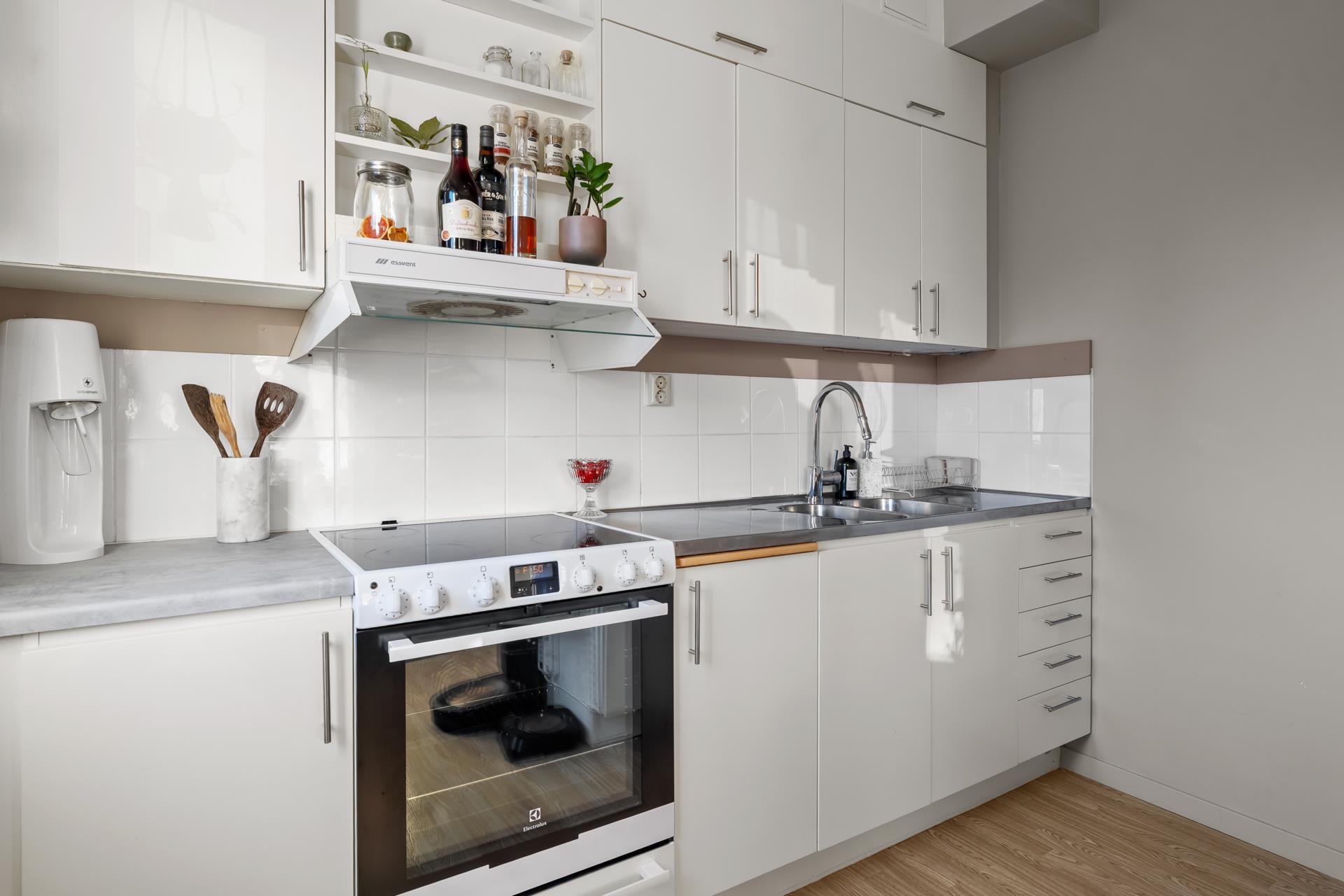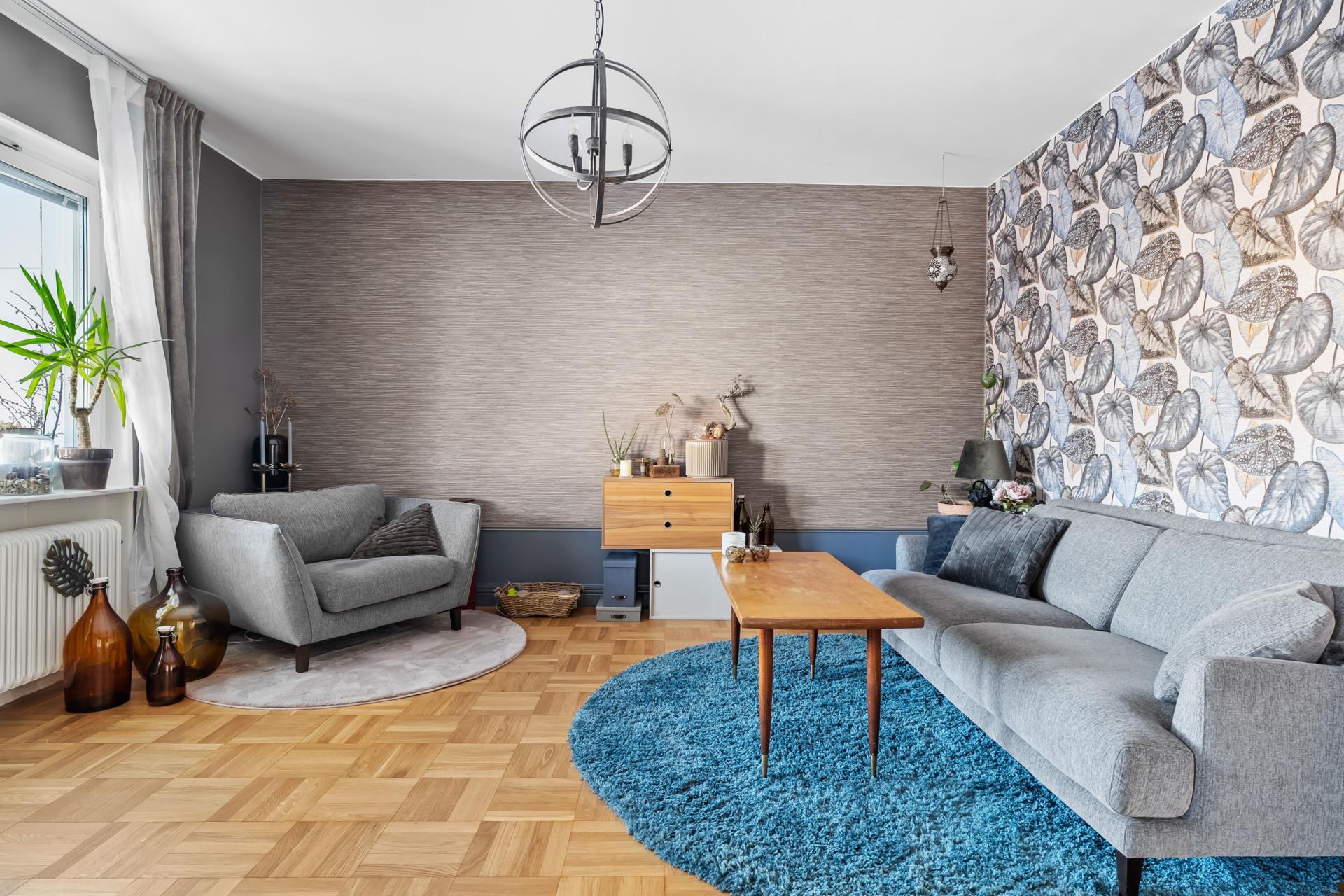 Bostaden öppnar upp med en rymlig hall som erbjuder goda förvaringsmöjligheter. Köket är smart planerat i vinkel och har fint ljusinsläpp samt gott om plats för matbord. Vardagsrummet är lättmöblerat och ger utrymme för både soffhörna och matplats. Härifrån når du den inglasade balkongen med utsikt mot den lugna innergården.