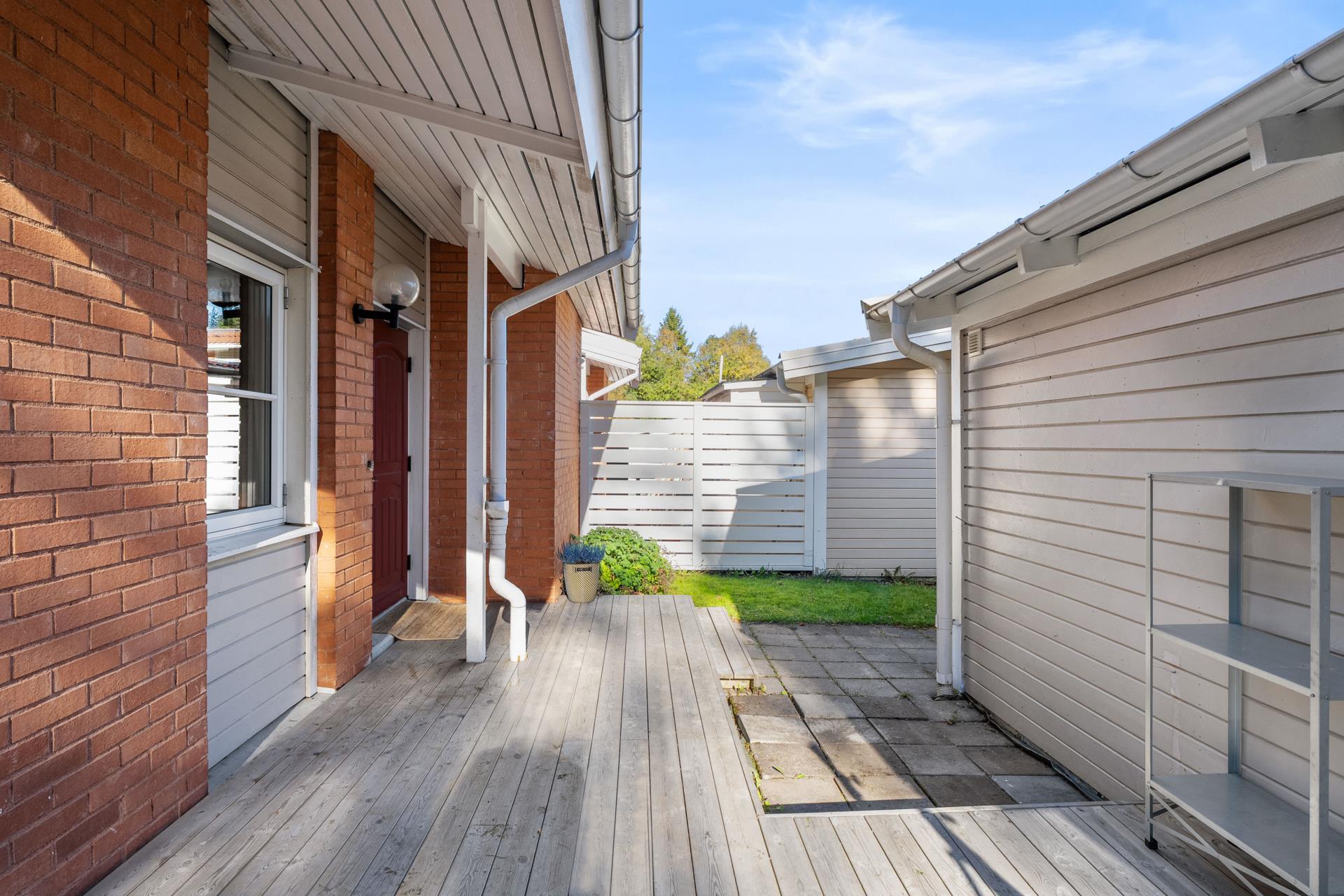 Köket är smakfullt utrustat med kyl, frys, diskmaskin, fläkt, inbyggnadsugn och induktionshäll. Den öppna planlösningen mot vardagsrummet skapar en härlig känsla av rymd och gemenskap. Här ligger ett vackert parkettgolv och väggarna har panel som ger en varm och hemtrevlig atmosfär. Från vardagsrummet finns utgång till ett inglasat uterum där du kan njuta av solens strålar från morgon till kväll. Utanför väntar en välskött trädgård med gräsmatta, grillplats, öppen uteplats och odlingslådor – en riktigt mysig och skyddad uteoas!