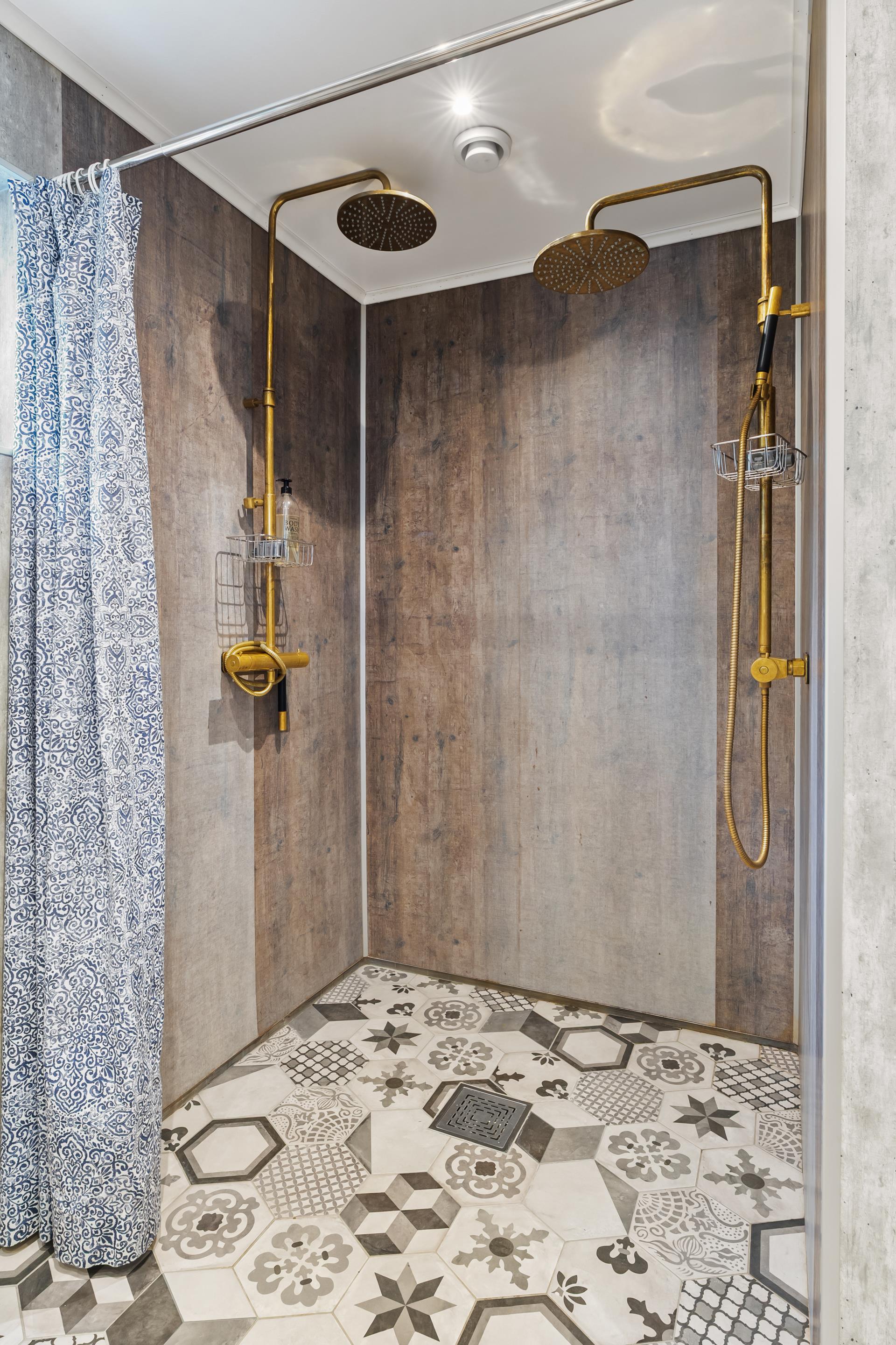 När du kommer upp till övervåningen möts du av en mindre hall som leder till det fantastiskt fina badrummet – smakfullt renoverat med våtrumsskivor på väggarna, klinkergolv, dubbla duschar, wc, handdukstork och tvättställ. Även här finns golvvärme för extra komfort.