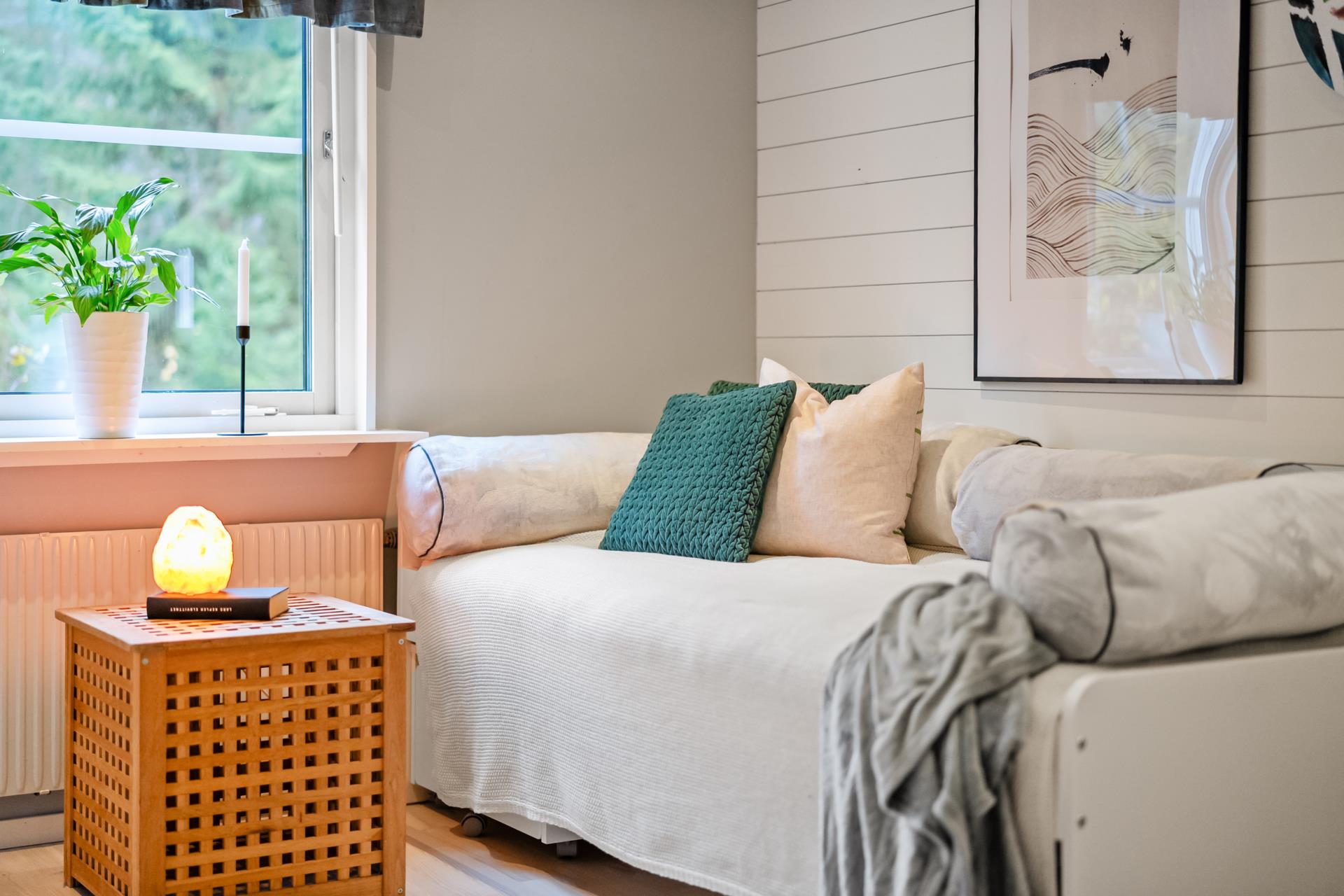 Dessutom finns ytterligare ett sovrum som idag är uppdelat i två mindre rum – perfekt för barn eller gäster. Vill man hellre ha ett större rum är det enkelt att återställa.