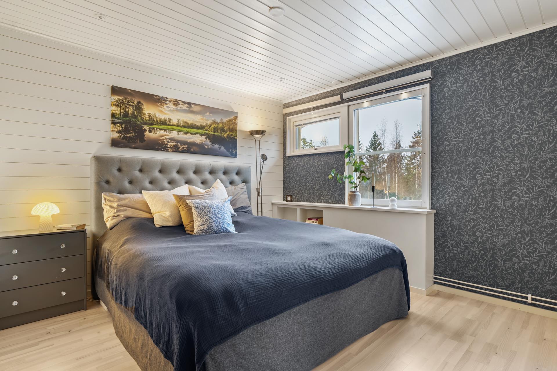 Det stora sovrummet bjuder på gott om utrymme, en rymlig garderob som även kan användas som hemmakontor, samt en praktisk garderobsvägg.